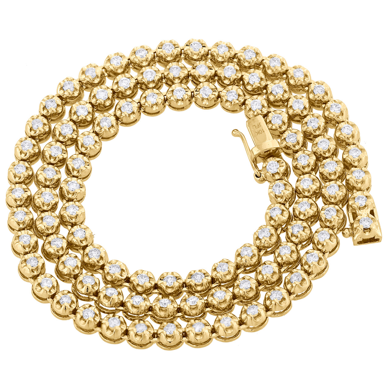 New to our Rodeo Jewelers Collection is this popular Crown Style Prong Set Solitiare Tennis Round Diamond Necklace / Chain. Handcrafted in-house in solid 10K Yellow Gold, this chain has a well built frame to withstand daily wear and tear. Crown Link frame has solid weight to it. This diamond chain comes in 20 inches (but can be made on special request based on the length needed). The weight is approximately 37 grams for 20" necklace. These are all 100% genuine full cut round diamonds held between the gold mounting in a prong setting, making the overall appearance larger and lustrous. The diamonds are of matching quality within an SI2 - I1 with a G - H range with fully faceted round cut diamonds. All diamonds are 100% natural and are NOT enhanced in any way. Radiant with 5.85 ct. t.w. of genuine diamonds, this necklace is polished to a lustrous bright shine. A box clasp closure with safety latches insures your piece is secured in style. This chain will make a great addition to your jewelry collection. Diamond size used in this chain is 2.40mm diamond which is approx. 6 pointers each. Total of 99 diamonds in this chain. This chain is made in-house so the size of the diamond and length of the chain along with purity of the gold can be adjusted to your liking.