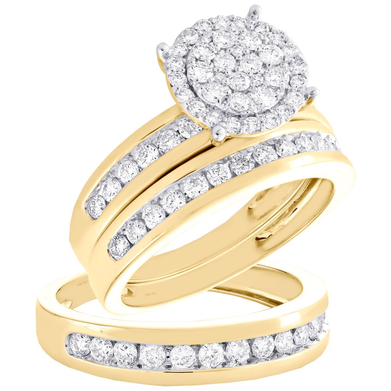 (9.2 gr. of 14K Yellow Gold | Total Carat Weight: 1.50 ct. t.w. of White Diamonds | Women's Combined Band Width: 8mm | Men's Band Width: 5mm | Clarity: SI1 - SI2 | Color: H - I | Men's and Women's Genuine Round Cut Diamond Matching Diamond Trio Bridal Set Rings)