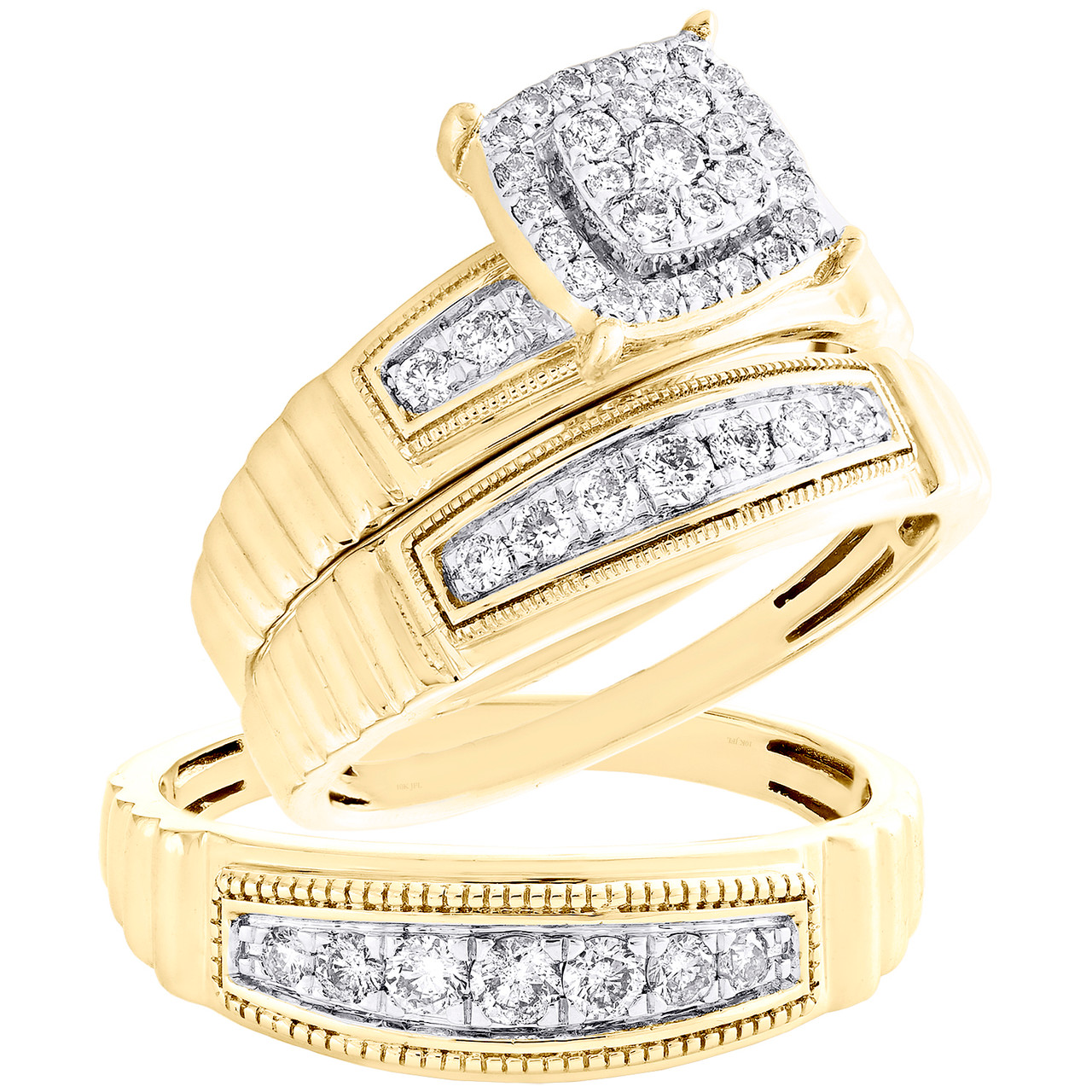 (7.7 gr. of 10k Yellow Gold | Total Carat Weight: 0.75 ct. t.w. of White Diamonds | Women's Combined Band Width: 10.5mm | Men's Band Width: 6.5mm | Clarity: SI1 - SI2 | Color: H - I | Men's and Women's Earth Mined Genuine Diamond Matching Diamond Trio Set Bridal Ring and Men's Band)