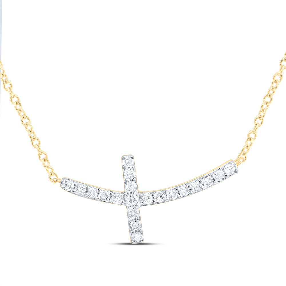 10K Yellow Gold Genuine Diamond Womens Curved Sideways Cross 18" Necklace 1/6 CT