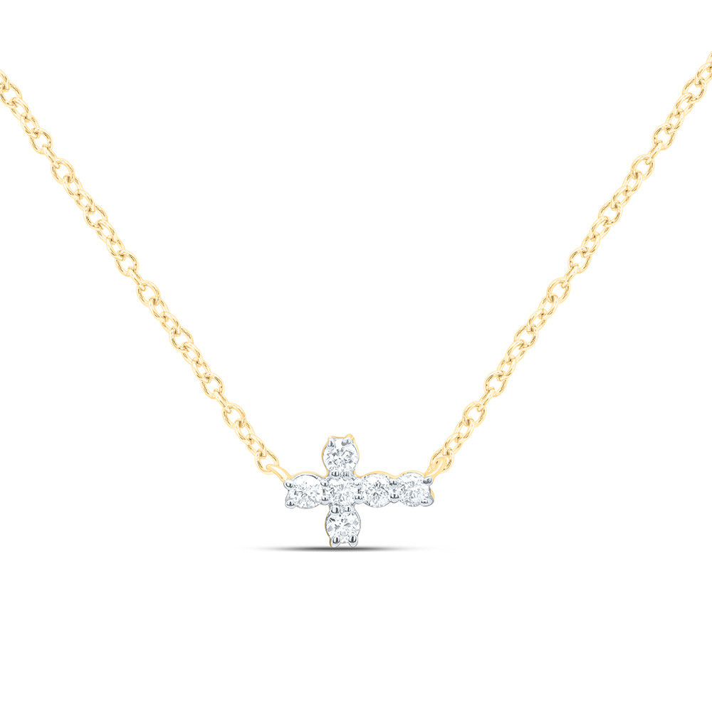 10K Yellow Gold Prong Diamond Womens Mini Sideways Cross 18" Necklace 1/12 CT