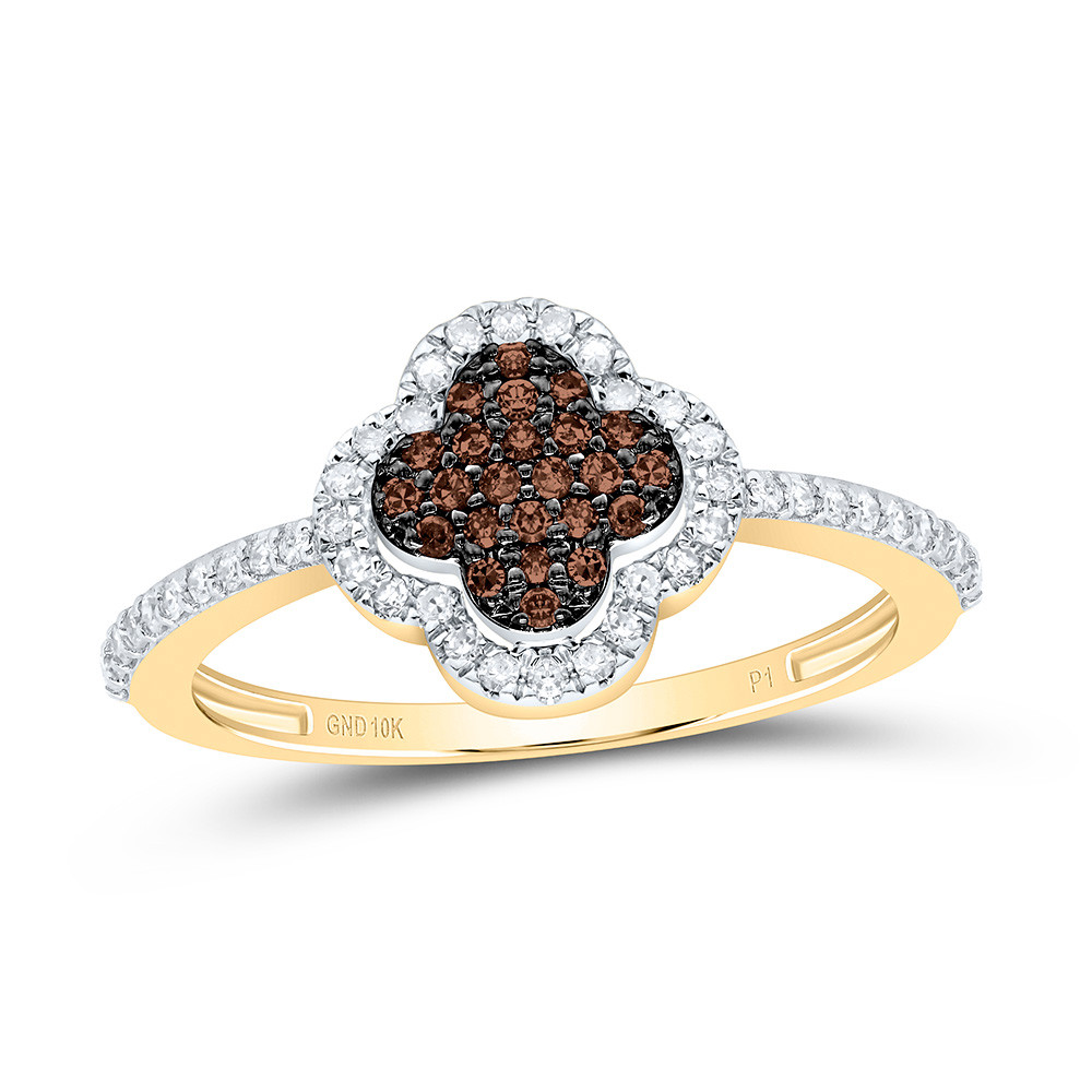 - 10K Yellow Gold Real Brown Diamond Cluster 4 Leaf Clover Right Hand Ring 1/4 CT