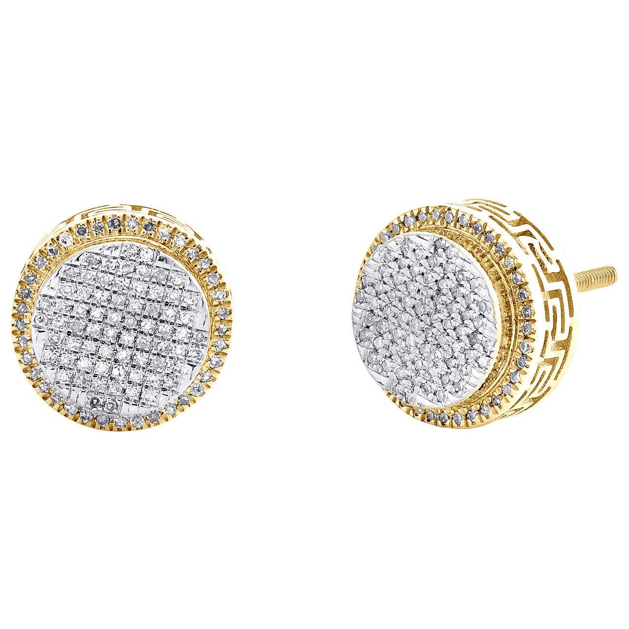 - 10K Yellow Gold Real Diamond 11mm Halo 3D Greek Key Circle Stud Earrings 1/4 CT