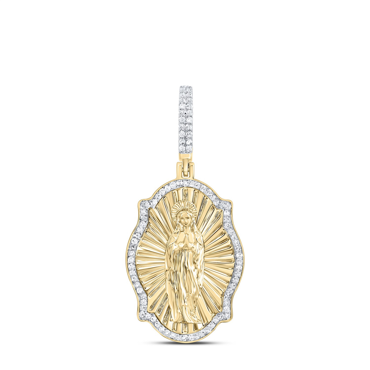 This eye-catching diamond Virgin Mother Mary Statement Pendant is crafted in solid 10K Yellow Gold and shimmering White diamonds, ensuring sparkle from every angle. Radiant with 3/8 ct. t.w. of diamonds, this pendant is polished to a lustrous shine. Exclusive style has a well built frame with caged back to withstand everyday wear and tear. The diamonds are secured in Prong setting close together, making the overall appearance larger and lustrous. Damond bail to compliment this pendant. These are all 100% genuine Round cut diamonds with matching clarity and color throughout. This pendant measures 1.70" long and weighs approx. 5.6 gr. This one of a kind piece would make a perfect addition to your jewelry collection.
