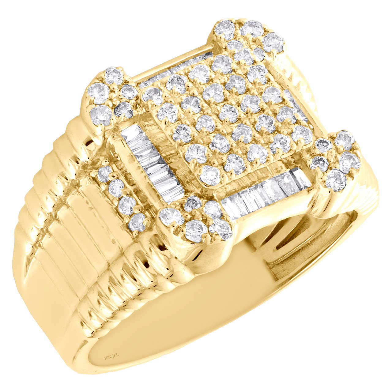- 10K Yellow Gold Round & Baguette Diamond 15mm Square Pinky Ring Band 0.95 CT.