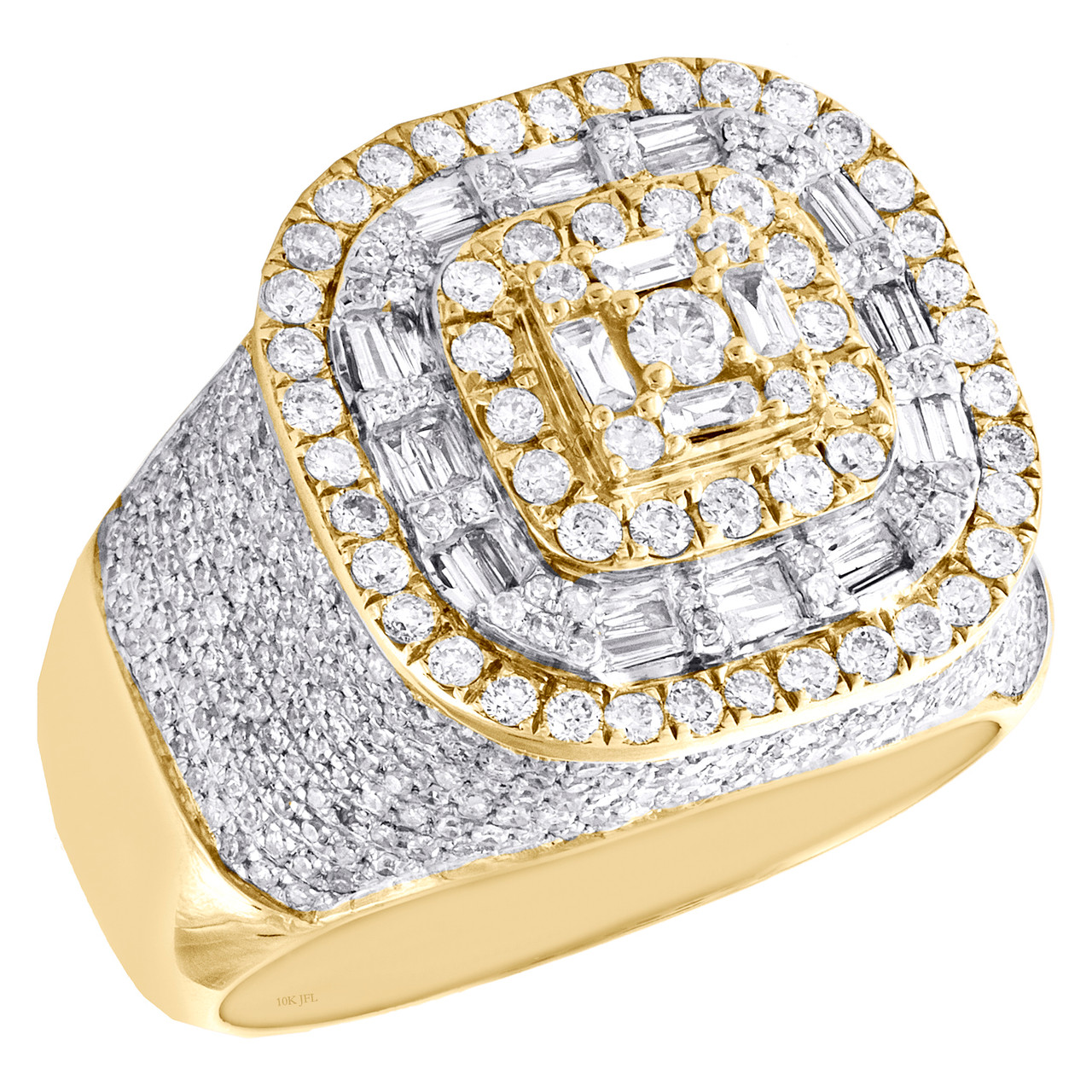 - 10K Yellow Gold Round & Baguette Diamond 18mm Square Cluster Pinky Ring 2.30 CT.