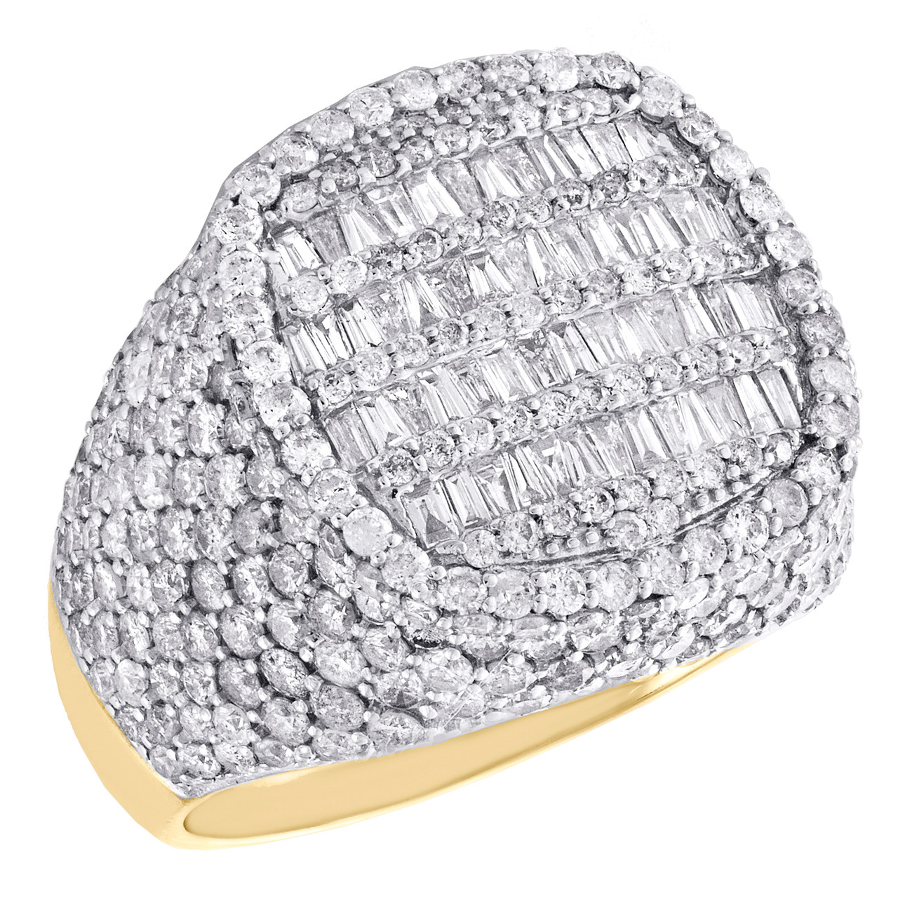 - 10K Yellow Gold Round & Baguette Diamond 19mm Domed Cluster Pinky Ring 5.59 CT.