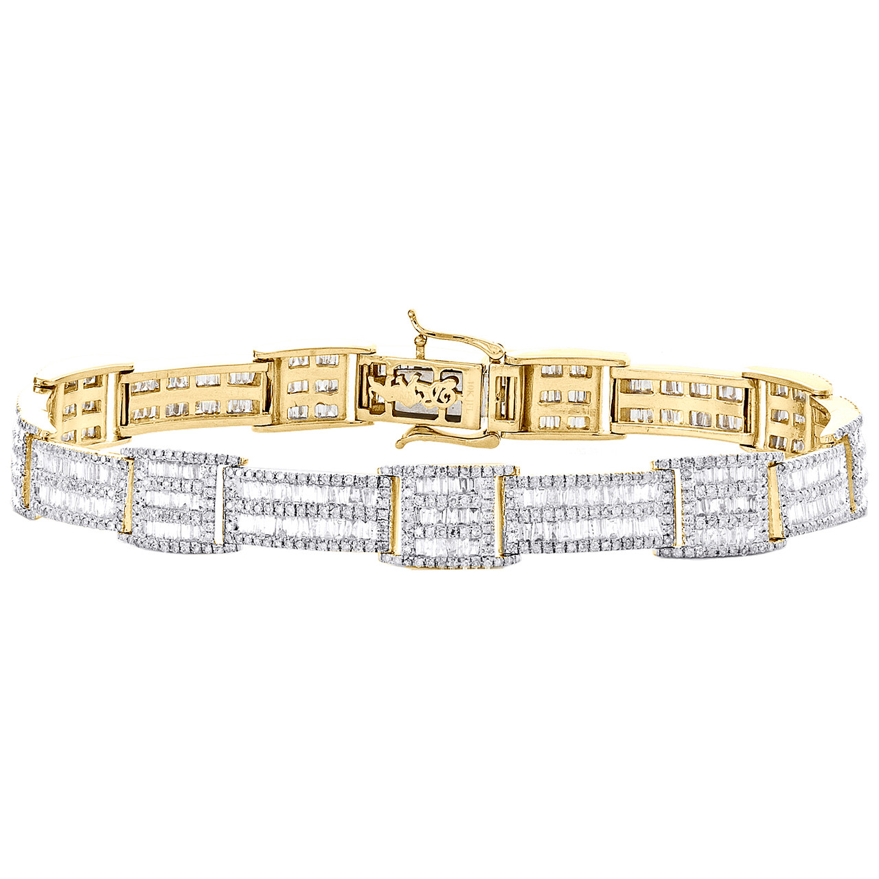(27.4 gr. of 10K Yellow Gold | Total Carat Weight: 6.25 ct. t.w. of White Diamonds | Length: 8.75" | Width: 9mm | Clarity: SI2 - I1 | Color: G - H | Men's Genuine Round and Baguette Diamond Fancy Statement Link Bracelet)
