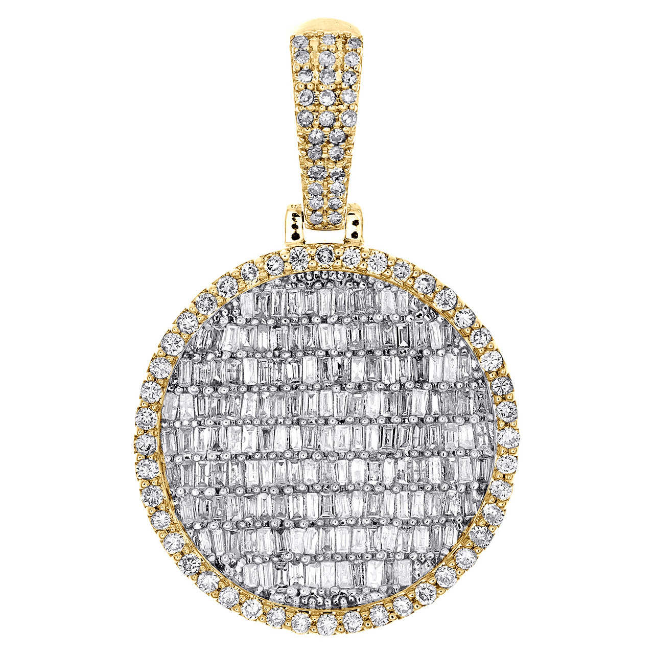 (7.2 gr. of 10K Yellow Gold | Total Carat Weight: 1.60 ct. t.w. of White Diamonds | Length: 1.40" (including bail) | Width: 0.90" | Thickness: 5mm | Clarity: I1 - I2 | Color: H - I | Men's Genuine Round & Baguette Cut Diamond Circle Frame Medallion Pendant Fancy Statement Charm)