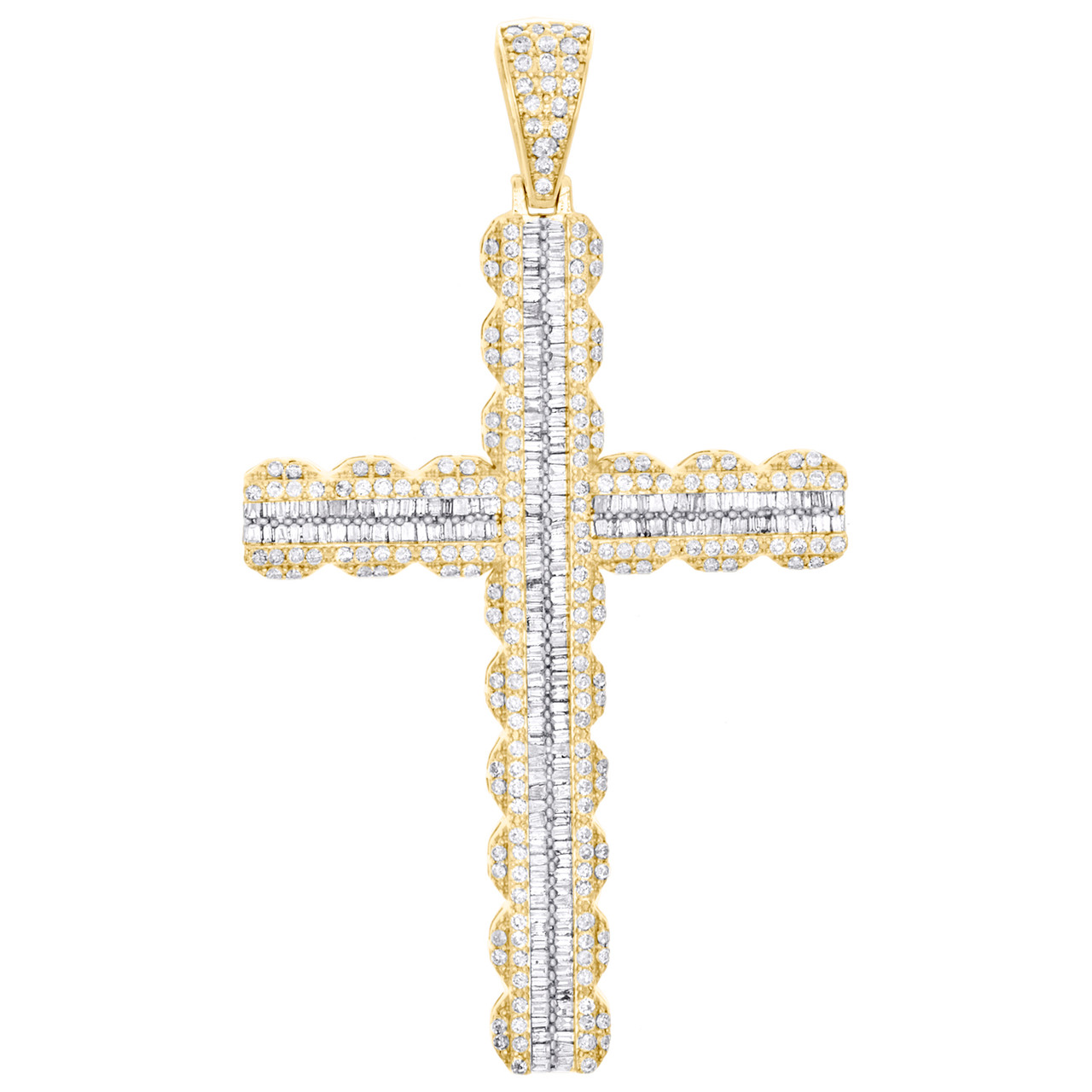 (17.4 gr. of 10K Yellow Gold | Total Carat Weight: 3.50 ct. t.w. of White Diamonds | Length: 3.10" (Including Bail) | Width: 1.80" | Thickness: 6mm | Clarity: SI2 - I1 | Color: H - I | Men's Genuine Round and Baguette Diamond Fancy Cluster Cross Pendant Statement Charm)