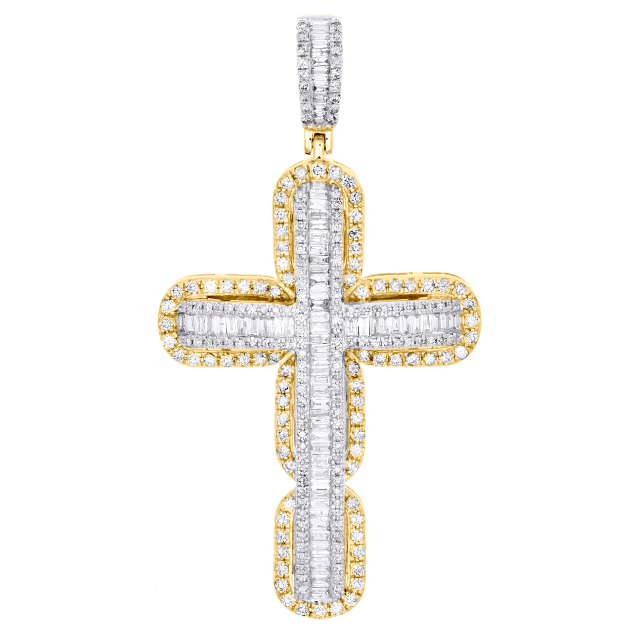 (9.1 gr. of 10K Yellow Gold | Total Carat Weight: 2 ct. t.w. of White Diamonds | Length: 2.15" (Including Bail) | Width: 1.15" | Thickness: 7mm | Clarity: I1 - I2 | Color: H - I | Men's Genuine Round and Baguette Diamond Religious Cluster Cross Pendant Statement Charm)