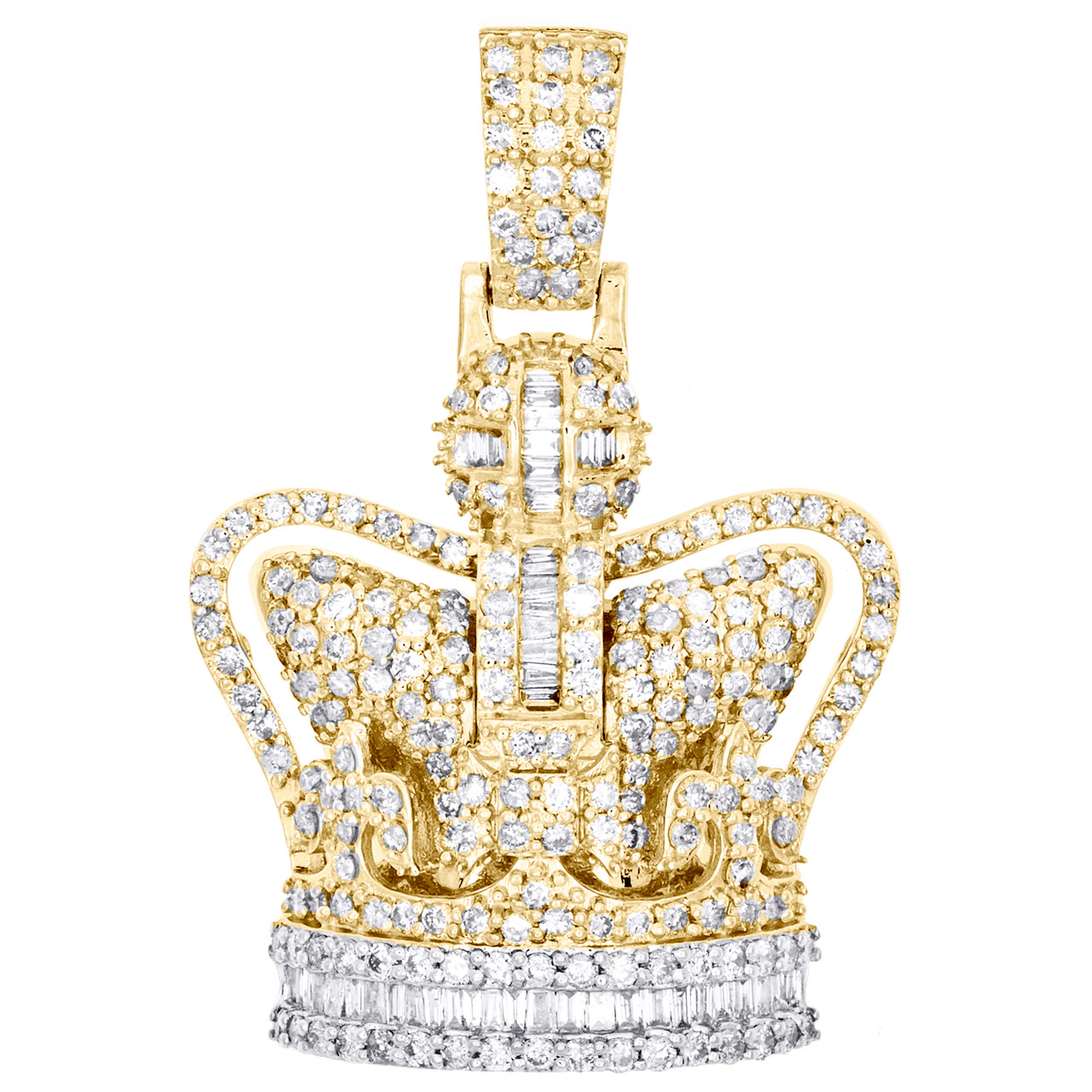 This eye-catching diamond King Crown Royalty Hat Statement Pendant is crafted in solid 10K Yellow Gold and shimmering White diamonds, ensuring sparkle from every angle. Radiant with 2.45 ct. t.w. of diamonds, this pendant is polished to a lustrous shine. Exclusive style has a well built frame with cagedback to withstand everyday wear and tear. The diamonds are secured in Prong and Channel setting close together, making the overall appearance larger and lustrous. Exclusive diamond bail to compliment this pendant. These are all 100% genuine Round and Baguette cut diamonds with matching clarity and color throughout. This pendant measures 1.50" long and weighs approx. 10.8 gr. This one of a kind piece would make a perfect addition to your jewelry collection.