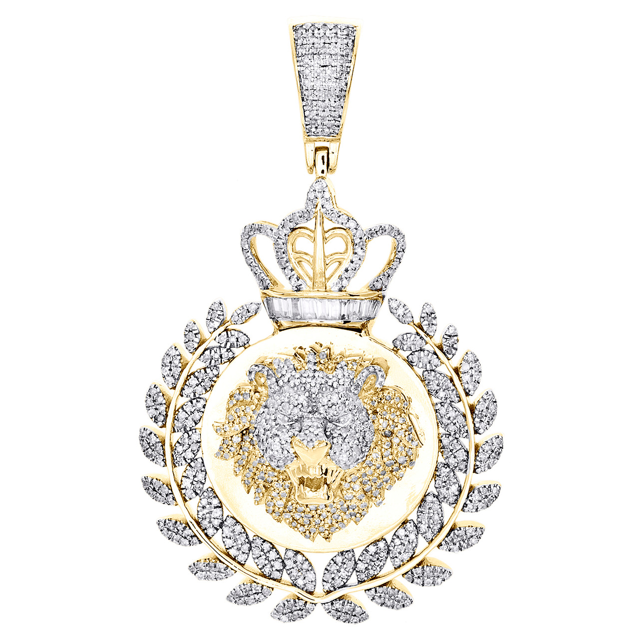 - 10K Yellow Gold Round & Baguette Diamond Lion Medallion Pendant Charm 1.45 CT.