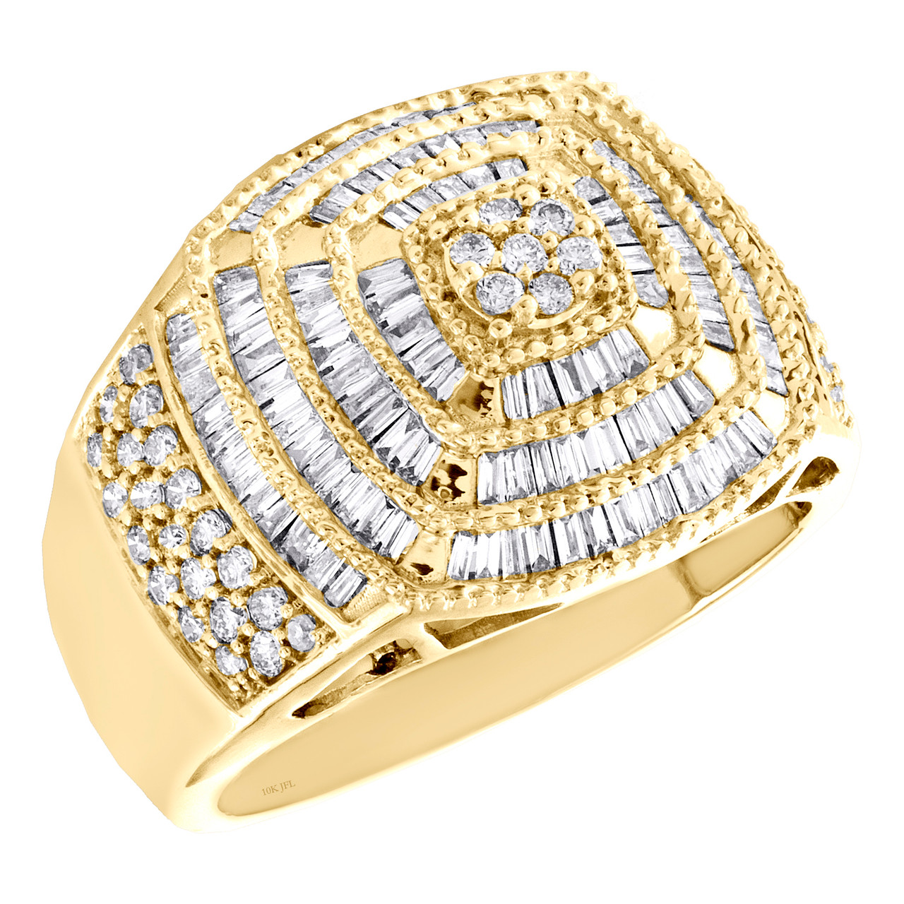 A bold and manly look, this sparkling diamond ring is just the perfect style for him. Brilliantly casted in 10K Yellow Gold, this ring features sparkling diamonds set in 17mm wide frame. This ring design was intricately thought out so it can be worn for any occasion, no matter how casual or fancy. Milgrain Square frame with diamonds is the focal point of this fancy statement band, making a bold fashion statement. Make an impression with this exclusive ring captivating 1.15 ct. t.w. of genuine Round and Baguette cut diamonds, with high polished to a lustrous shine. This ring is comfort fit with caged back and weighs approx. 8.6 gr. All diamonds are 100% genuine and are matched to perfection. The diamonds are secured in Prong and Channel setting, making the overall appearance larger and lustrous. Available in size 10. If a different size is needed, please send us a message, sizing charges apply.