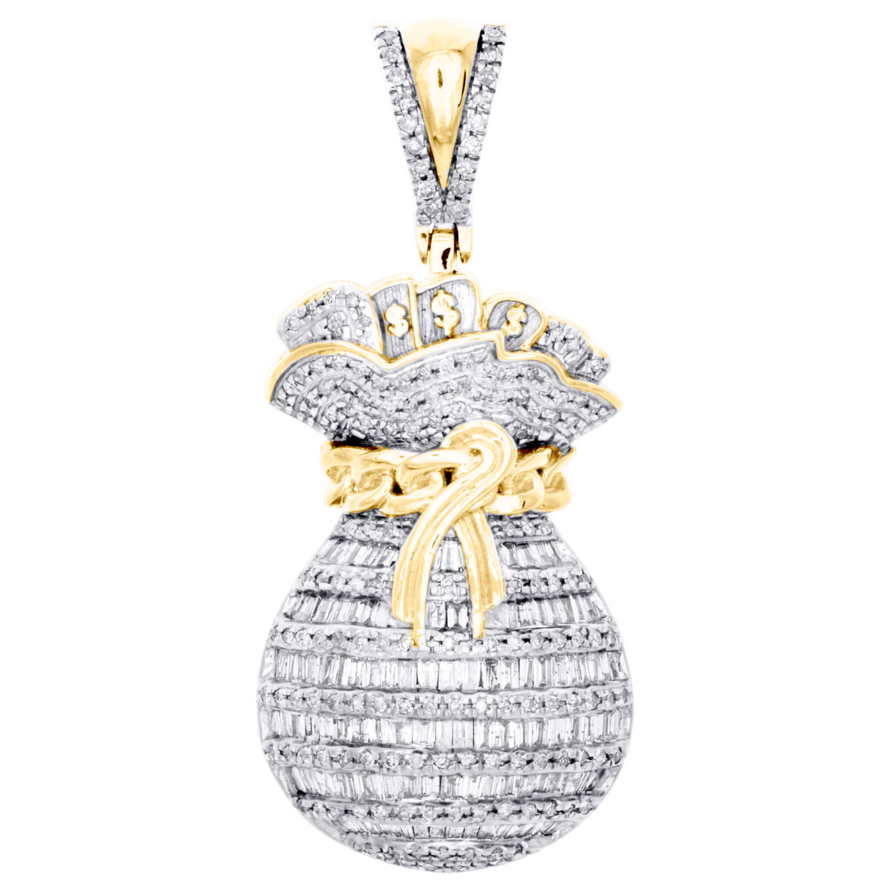 (7.3 gr. of 10K Yellow Gold | Total Carat Weight: 1.10 ct. t.w. of White Diamonds | Length: 1.60" (Including Bail) | Width: 0.70" | Thickness: 7mm | Clarity: I1 - I2 | Color: H - I | Men's Genuine Round and Baguette Diamond Money Bag Pendant Statement Charm)