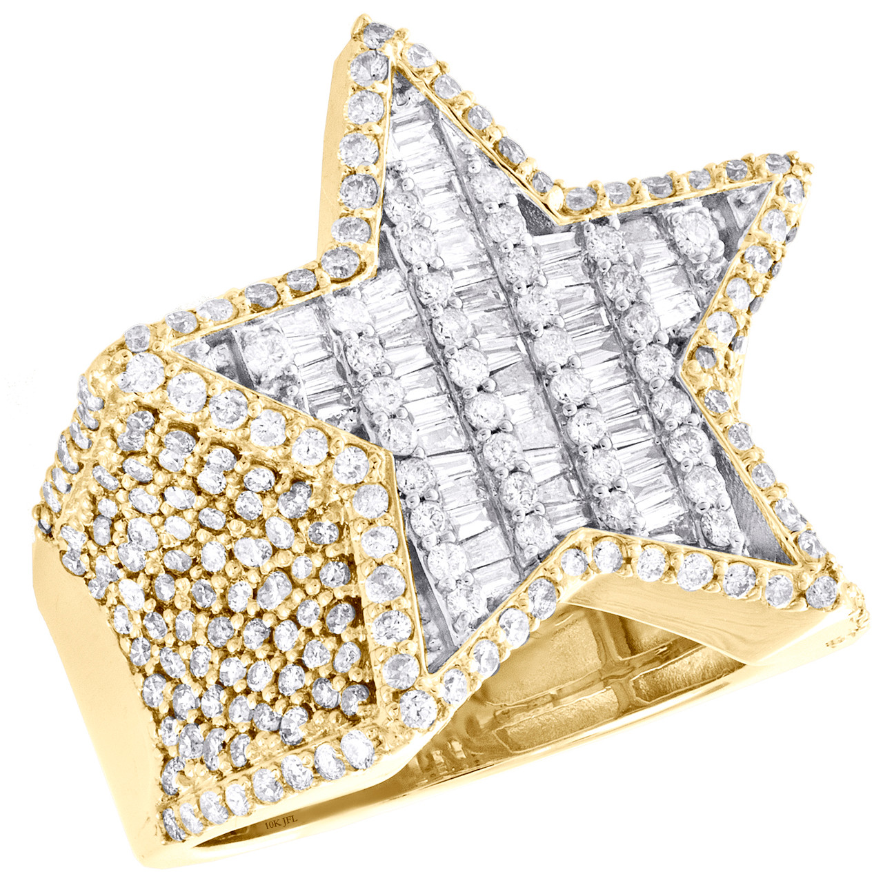 A bold and manly look, this sparkling diamond ring is just the perfect style for him. Brilliantly casted in 10K Yellow Gold, this ring features sparkling diamonds set in 24mm wide frame. This ring design was intricately thought out so it can be worn for any occasion, no matter how casual or fancy. Super Star frame with diamonds is the focal point of this fancy statement band, making a bold fashion statement. Make an impression with this exclusive ring captivating 2.80 ct. t.w. of genuine Round and Baguette cut diamonds, with high polished to a lustrous shine. This ring is comfort fit and weighs approx. 15.3 gr. All diamonds are 100% genuine and are matched to perfection. The diamonds are secured in Invisible and Prong setting, making the overall appearance larger and lustrous. Available in size 10. If a different size is needed, please send us a message, sizing charges apply.