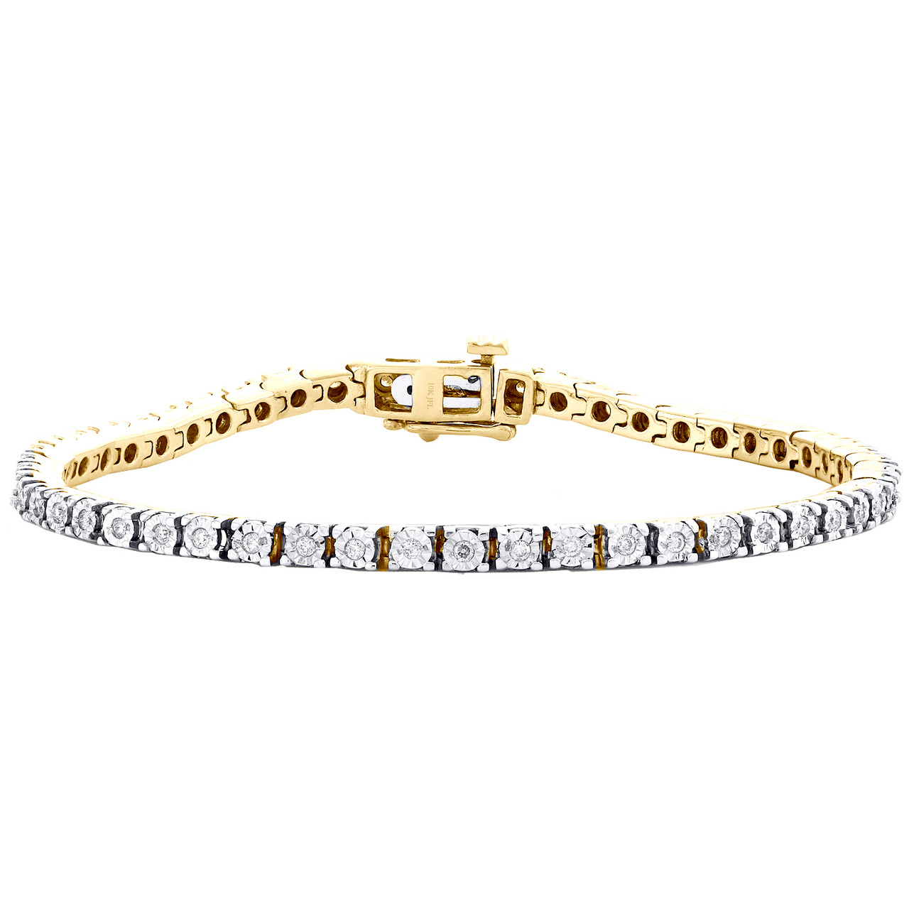 A new sophisticated and elegant look added to our diamond bracelet collection is this Single Row Miracle Set Illusion Bracelet. Casted in solid 10K Yellow Gold and genuine diamonds. Well built, this bracelet has sturdy frame for durability for comfort fitting. All round cut diamonds are in Bezel / Miracle setting, making the overall appearance larger and lustrous. This statement piece will make a great addition to your jewelry collection. Radiant with 1/2 ct. t.w. of natural White diamonds, this bracelet is high polished to a lustrous bright shine. All the Round cut diamonds in this bracelet are equivalent in color and clarity, giving this bracelet a comparable shine and luster throughout. This bracelet has a diamond Tongue and Groove Box Clasp with additional Safety Latch for secure wear. This single row miracle setting bracelet measures 3.25mm wide and weighs 12.1 gr.