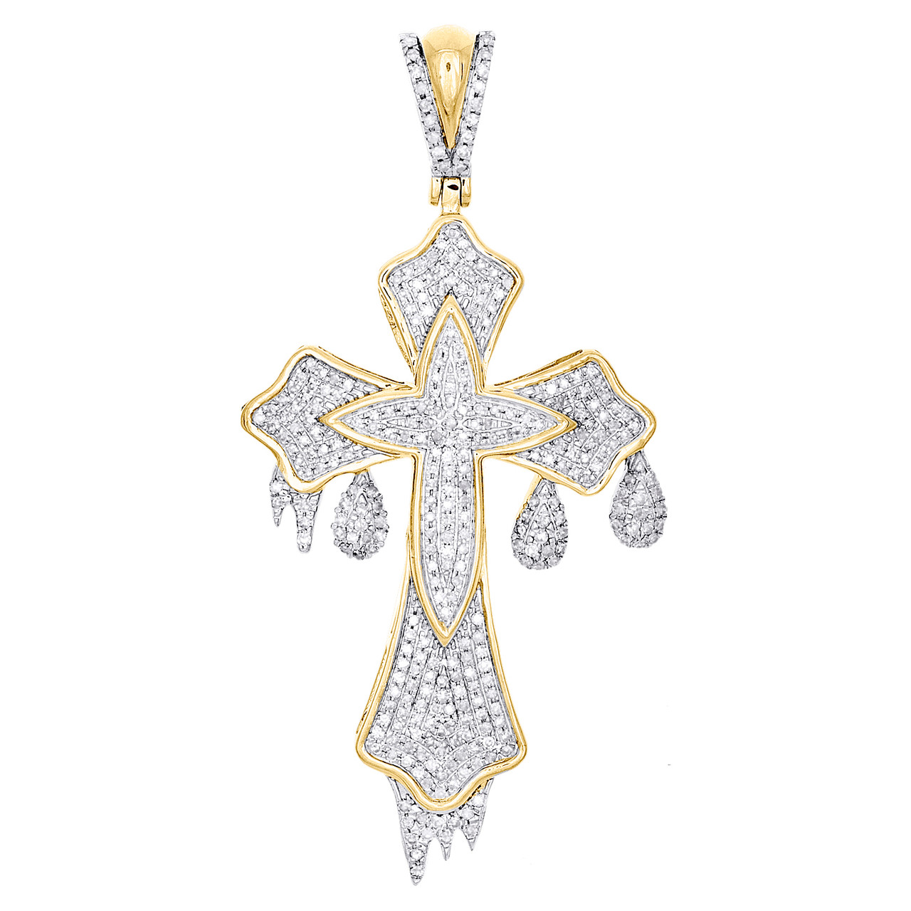- 10K Yellow Gold Round Diamond Fancy Cross Pendant 2.10" Pave Drip Charm 3/4 CT.