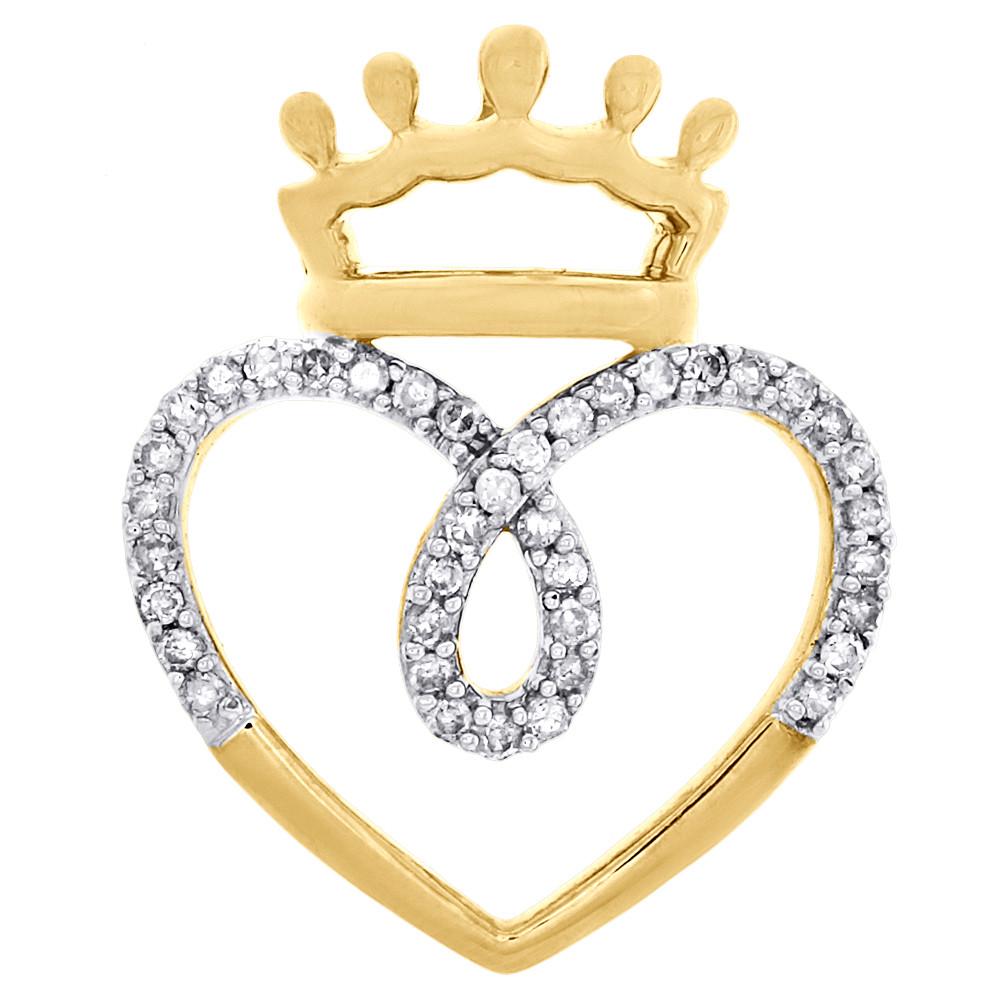 This eye-catching Crowned Heart diamond pendant is crafted in solid 10K yellow gold and shimmering white diamonds, ensuring sparkle from every angle. Radiant with 1/5 ct. t.w. of genuine diamonds, this pendant is high polished to a bright shine. Exclusive style has a well built frame to withstand everyday wear and tear. The diamonds are securely held between the gold mounting in a pave setting close together, making the overall appearance larger and lustrous. Hidden Slide style gives this pendant a exclusive look. These are all 100% genuine round diamonds. All the diamonds are of same clarity and color throughout. This women's pendant is 0.85 inch length and weighs approx. 2.1 grams. This one of a kind piece would make a perfect addition to your jewelry collection.