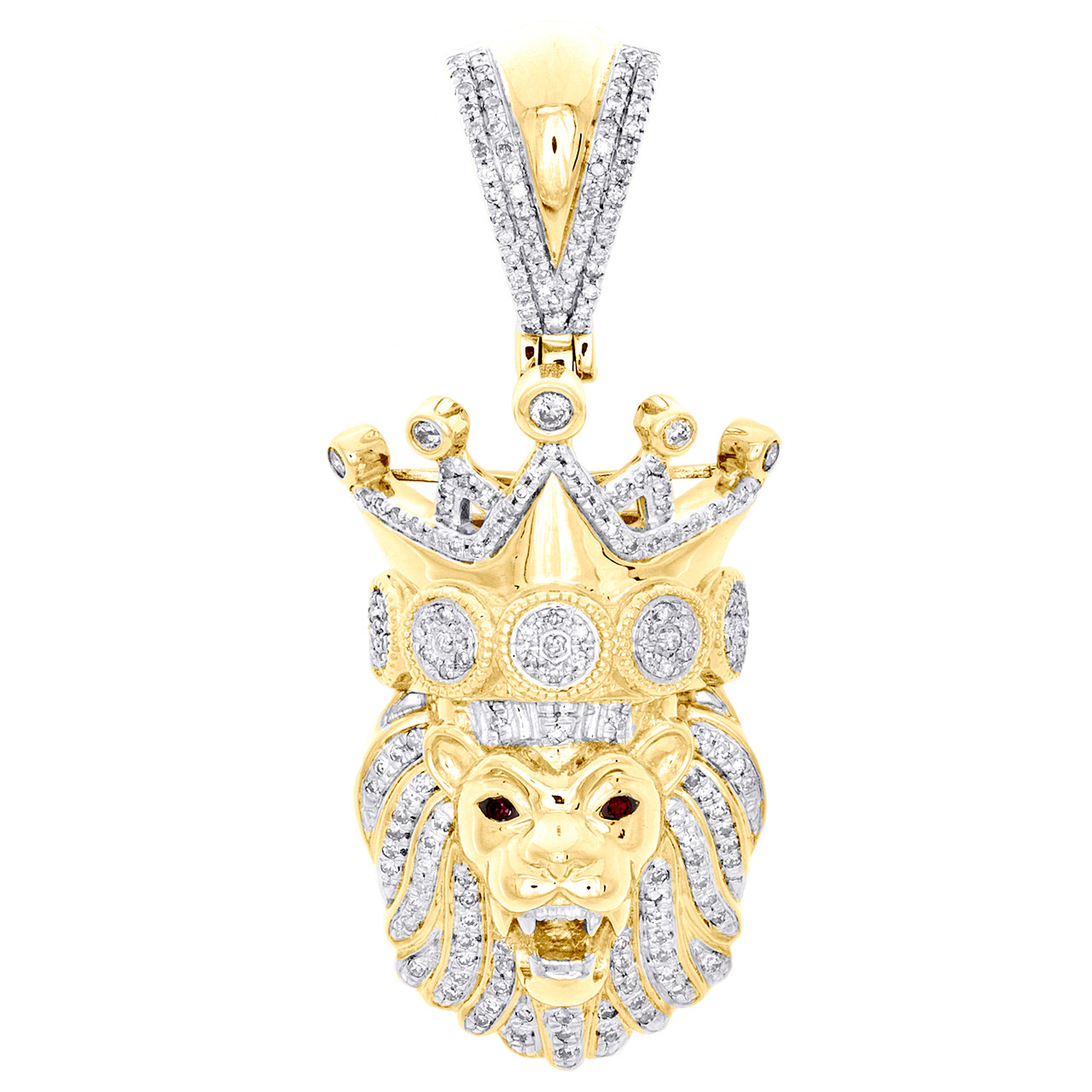 This eye-catching diamond Statement Lion Head King Crown Pendant is crafted in solid 10K Yellow Gold and shimmering White diamonds and Red gemstone, ensuring sparkle from every angle. Radiant with 1/2 ct. t.w. of diamonds, this pendant is polished to a lustrous shine. Exclusive style has a well built frame with caged back to withstand everyday wear and tear. The diamonds are secured in Pave setting close together, making the overall appearance larger and lustrous. Exclusive diamond bail to compliment this pendant. These are all 100% genuine Round cut diamonds with matching clarity and color throughout. This pendant measures 1.80" long and weighs approx. 10.1 gr. This one of a kind piece would make a perfect addition to your jewelry collection.