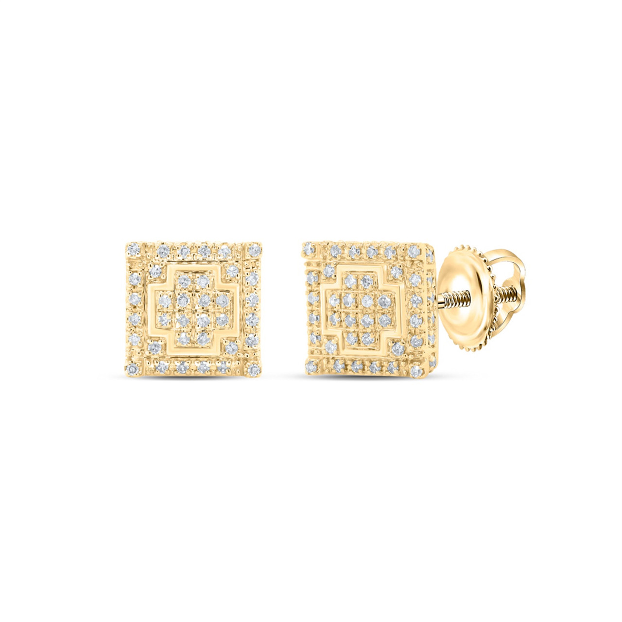 Stunning pair of studs added to our Rodeo Jewelers earring collection. These earrings are crafted in solid 10K Yellow Gold. Radiant with 0.28 ct. t.w. of genuine diamonds, these studs are high polished for a lustrous shine. These particular studs consist of genuine Round cut white diamonds in Prong setting, making the overall appearance larger and lustrous. Screw-backs for secure wear, these earrings will make a great gift for any occasion. Plus Sign 3D Square frame give these earrings depth and makes a bold fashion statement. Good size, these studs are 8mm wide and 3mm in thickness. These diamond studs / earrings weigh approx. 2 gr.
