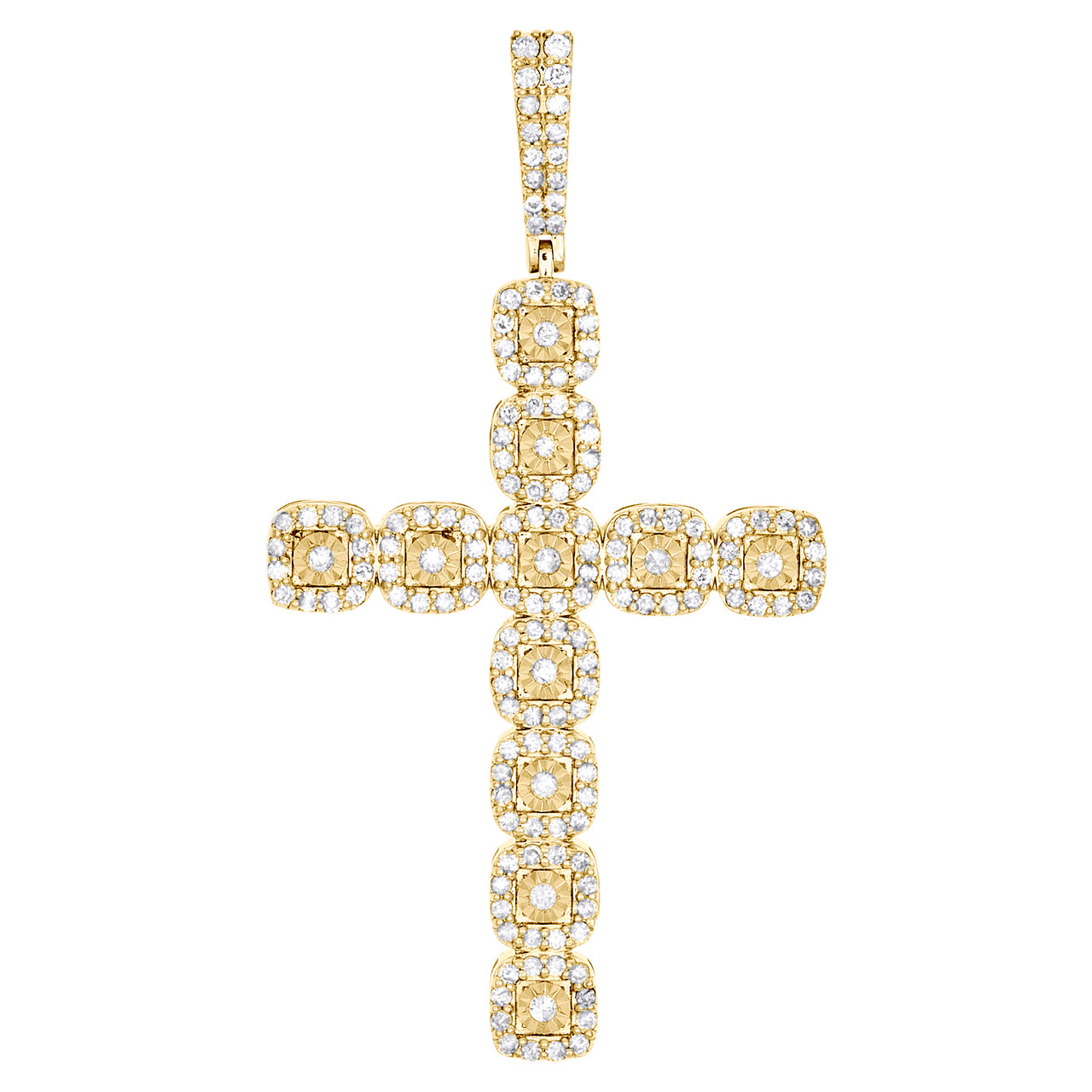 (9.5 gr. of 10K Yellow Gold | Total Carat Weight: 2 ct. t.w. of White Diamonds | Length: 2.70" (Including Bail) | Width: 1.45" | Thickness: 5mm| Clarity: SI2 - I1 | Color: H - I | Men's Genuine Round Diamond Fancy Cluster Cross Pendant Statement Charm)