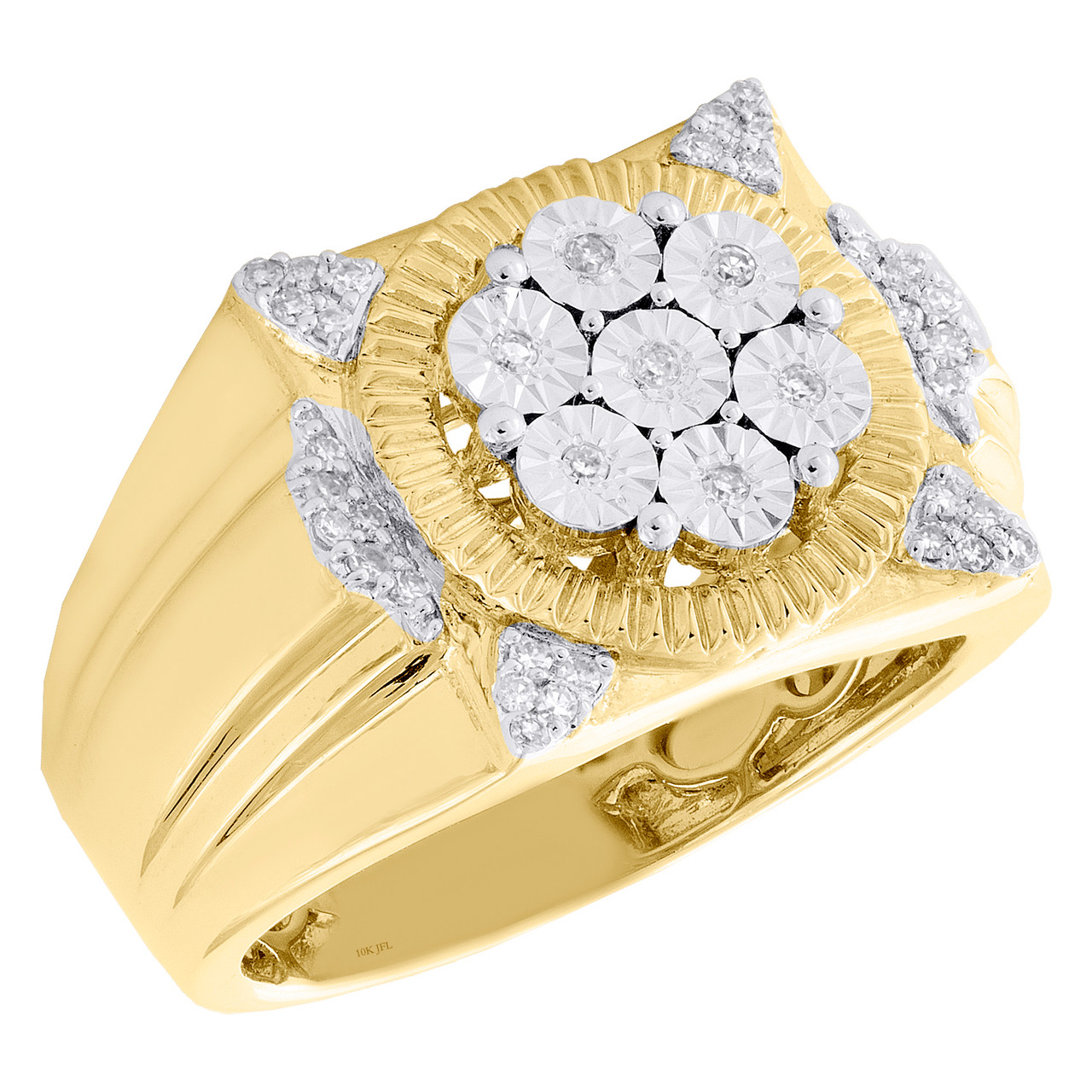 A bold and manly look, this sparkling diamond ring is just the perfect style for him. Brilliantly casted in 10K Yellow Gold, this ring features sparkling diamonds set in 15mm wide frame. This ring design was intricately thought out so it can be worn for any occasion, no matter how casual or fancy. Tier Fluted Center frame with diamonds is the focal point of this fancy statement band, making a bold fashion statement. Make an impression with this exclusive ring captivating 1/5 ct. t.w. of genuine Round cut diamonds, with high polished to a lustrous shine. This ring is comfort fit and weighs approx. 9.7 gr. All diamonds are 100% genuine and are matched to perfection. The diamonds are secured in Miracle and Prong setting, making the overall appearance larger and lustrous. Available in size 10. If a different size is needed, please send us a message, sizing charges apply.