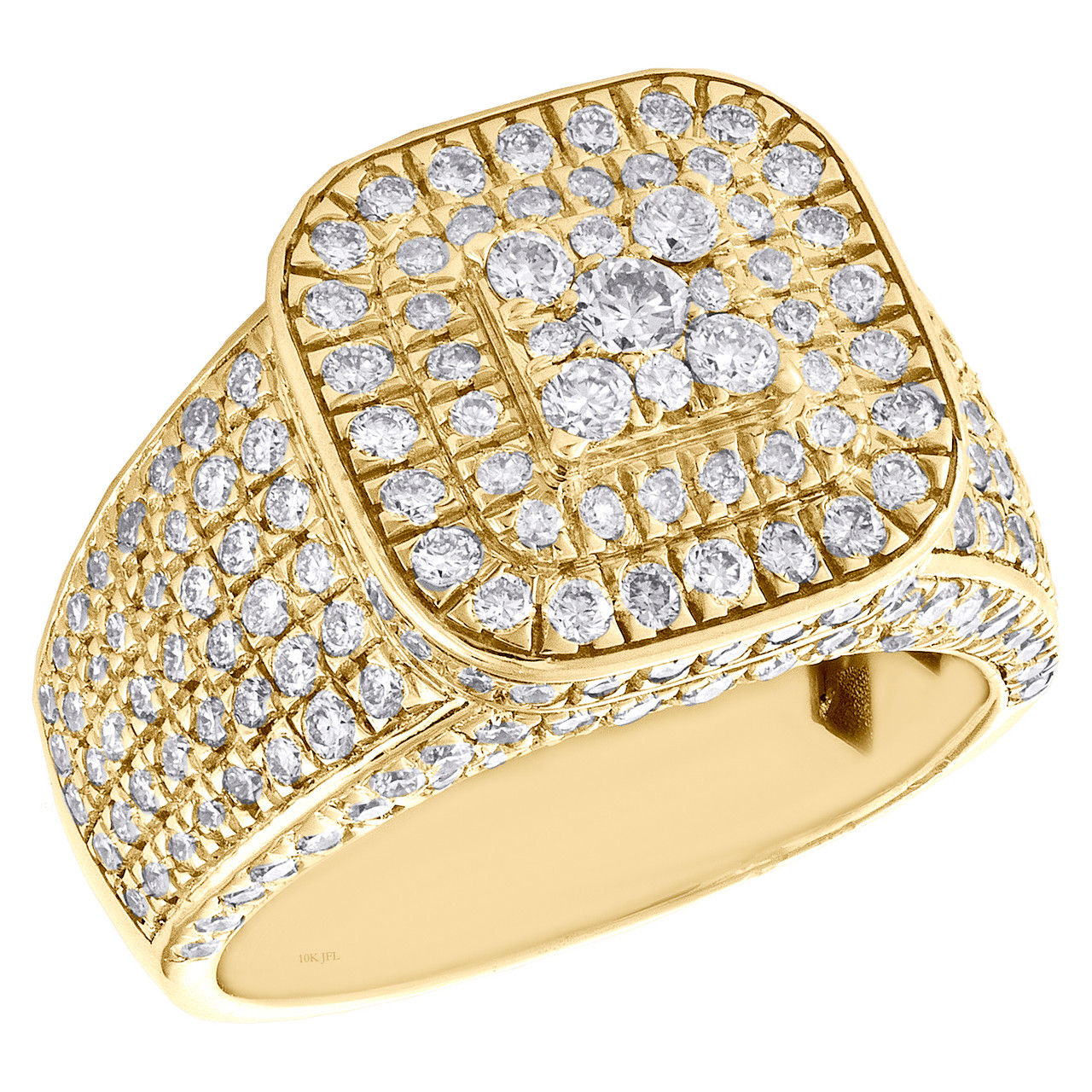 A bold and manly look, this sparkling diamond ring is just the perfect style for him. Brilliantly casted in 10K Yellow Gold, this ring features sparkling diamonds set in 16mm wide frame. This ring design was intricately thought out so it can be worn for any occasion, no matter how casual or fancy. 3D Raised Square frame with diamonds is the focal point of this fancy statement band, making a bold fashion statement. Make an impression with this exclusive ring captivating 3.01 ct. t.w. of genuine Round cut diamonds, with high polished to a lustrous shine. This ring is comfort fit and weighs approx. 11.9 gr. All diamonds are 100% genuine and are matched to perfection. The diamonds are secured in Prong setting, making the overall appearance larger and lustrous. Available in size 10. If a different size is needed, please send us a message, sizing charges apply.