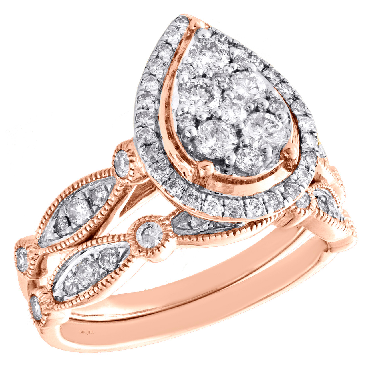 (5.3 gr. of 14K Rose Gold | Total Carat Weight: 1 ct. t.w. of White Diamonds | Center Width: 11.15mm | Band Width (shank): 7.5mm | Head Rise: 7.5mm | Clarity: SI2 - I1 | | Color: H - I | Women's Genuine Round Diamond Teardrop Cluster Filigree Style Halo Bridal Set Engagement Ring + Wedding Band )