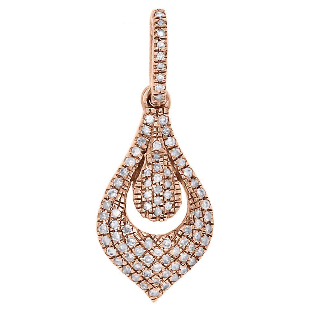 Rodeo Jewelers brings to you this beautiful teardrop pendant. Crafted in warm 14K rose gold, this pendant features an oval shaped frame filled with a glittering array of shimmering full cut round diamonds. Smaller accent diamonds are flooded throughout this pendant. The diamond lined bale is a thoughtful touch that completes the stunning style. A great look any time, this pendant captivates with 0.26 ct. total weight of diamonds and a polished to a bright shine. The diamonds are set in a share prong setting, close together for a uniform and even look. This pendant is 1" long and 0.40" wide.