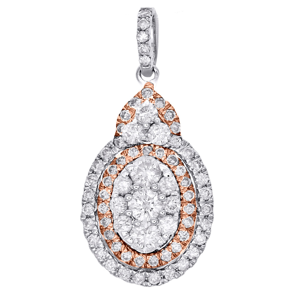 This eye-catching diamond pendant is crafted in fine 14k white & rose gold, in a tiered oval design with a cluster of round diamonds in the center with a double halo of white diamonds around it. Radiant with 0.88 ct. t.w. of genuine diamonds, this pendant is high polished to a bright shine. Exclusive style has a well built frame with open backing to withstand everyday wear and tear. This pendant weighs approx. 2.7 grams. The diamonds are securely held between the precious metal mounting in a shared prong setting to give off a big shine. Gold bail to match and give this pendant a high end custom look. These are all 100% genuine brilliant round diamonds. All the diamonds are of same clarity and color throughout. This item would make a perfect gift for any occasion.