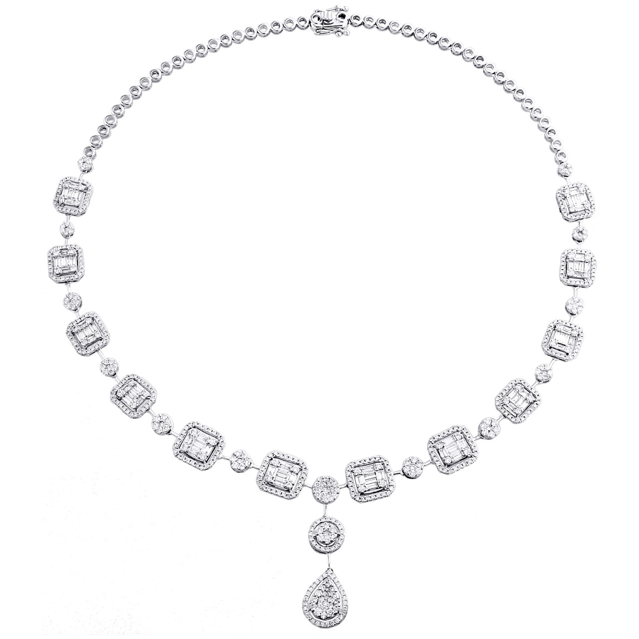 This beautiful statement diamond necklace is crafted in 14K White Gold and shimmering Round and Baguette cut diamonds with Alternating Drop Cluster Frame design. Radiant with 6.62 ct. t.w. of genuine diamond, this necklace is polished to a bright lustrous shine. The statement center pieces is 10mm at widest point and weighs approx. 25.6 gr. The diamonds are securely held between the gold mounting in Channel and Prong setting, making the overall appearance larger and lustrous . The necklace is 16" with 1" drop extension in length and is secured in style by Box Clasp. Make a bold statement with this one of a kind piece of jewelry.