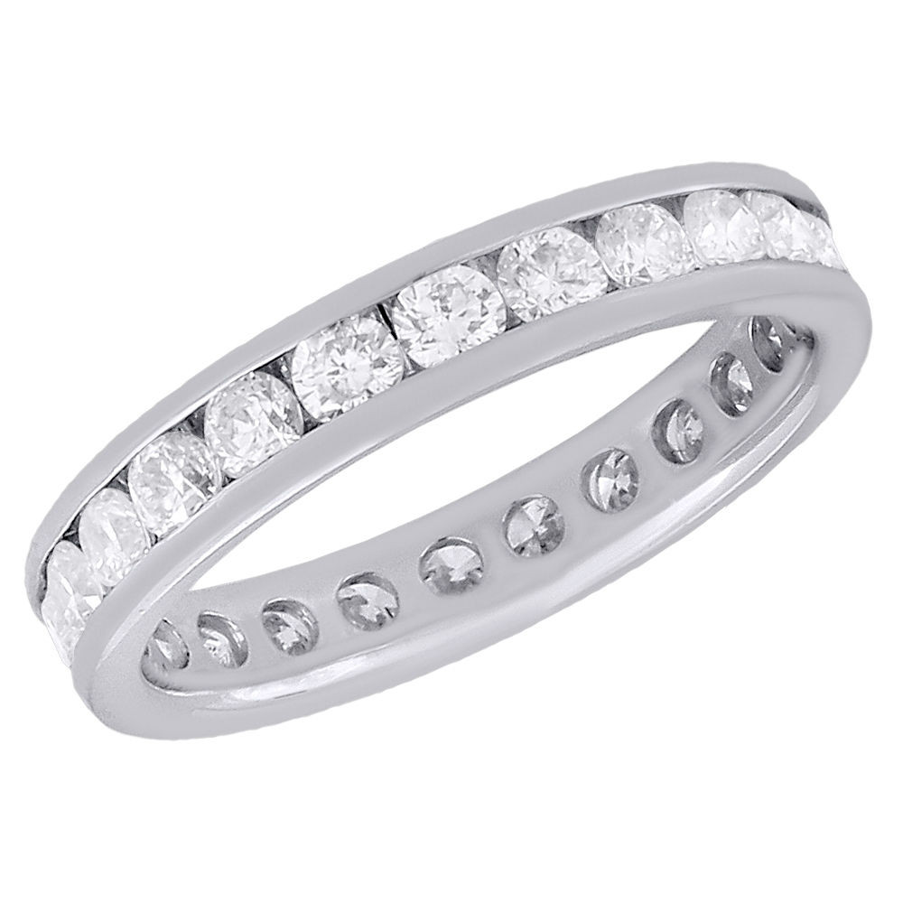 This item is part of our new diamond eternity band collection and comes brand new with tags. A brilliant look that symbolizes all the love you share, this diamond eternity band has no beginning and no end. Beautifully crafted in 14K white gold, this elegant ring features row of glistening round diamonds. This ring captivates with 1.53 Ct. of diamonds and polished to a brilliant shine. Each round cut diamond is full cut, and channel set. No better way to honor your wedding vows then a masterfully crafted eternity band. Solid back for extra support and durability.