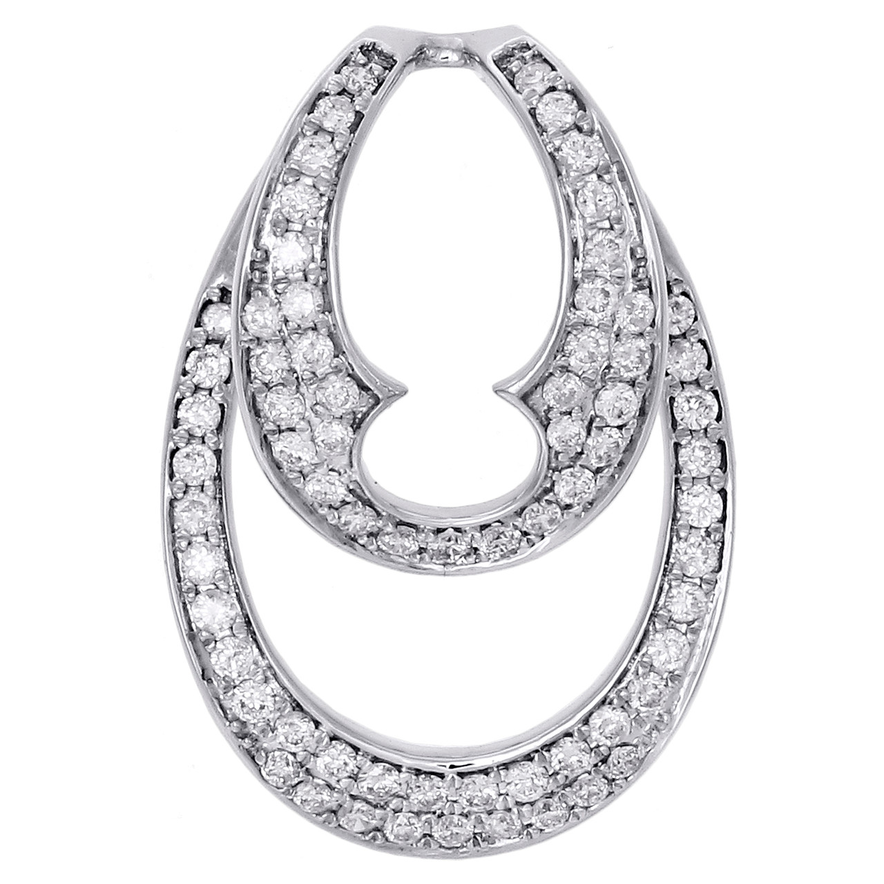 This eye-catching fancy Stacked Intertwined Oval Frame diamond slide pendant is crafted in solid 14K white gold and shimmering white diamonds, ensuring sparkle from every angle. Radiant with 1/2 ct. t.w. of genuine diamonds, this pendant is high polished to a bright shine. Exclusive style has a well built frame to withstand everyday wear and tear. The diamonds are securely held between the gold mounting in a setting close together, making the overall appearance larger and lustrous. Hidden Slide style gives this pendant a exclusive look. These are all 100% genuine round diamonds. All the diamonds are of same clarity and color throughout. This women's pendant is 1 inch in length and weighs approx. 2.6 grams. This one of a kind piece would make a perfect addition to your jewelry collection. collection.