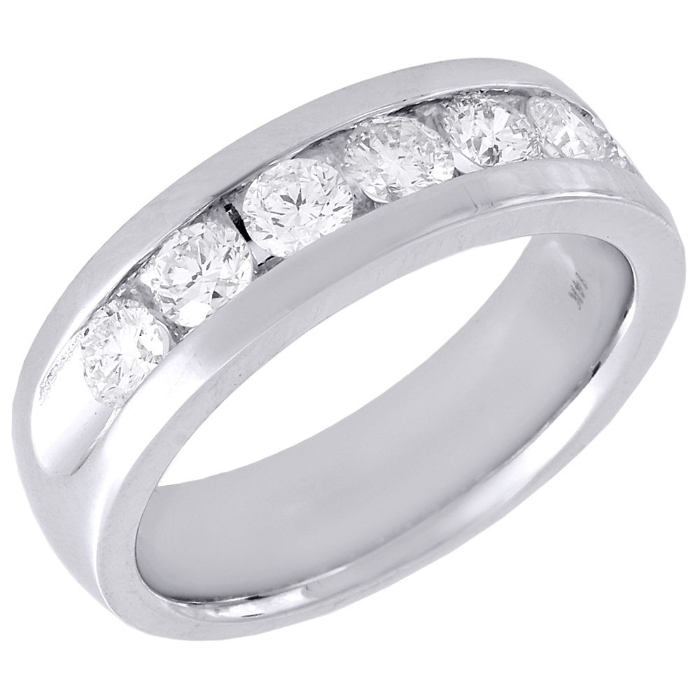 At approximately 1.50 carat total weight, seven round cut, channel-set diamonds sparkle in this elegant mens wedding band. Each stone has been hand selected and matched to perfection for consistent fire and brilliance throughout the ring. Crafted in eminent 14K White Gold, with a polished finish, this dynamic mens wedding band is the ideal choice for that special day. Solid back for comfort fitting and durability.