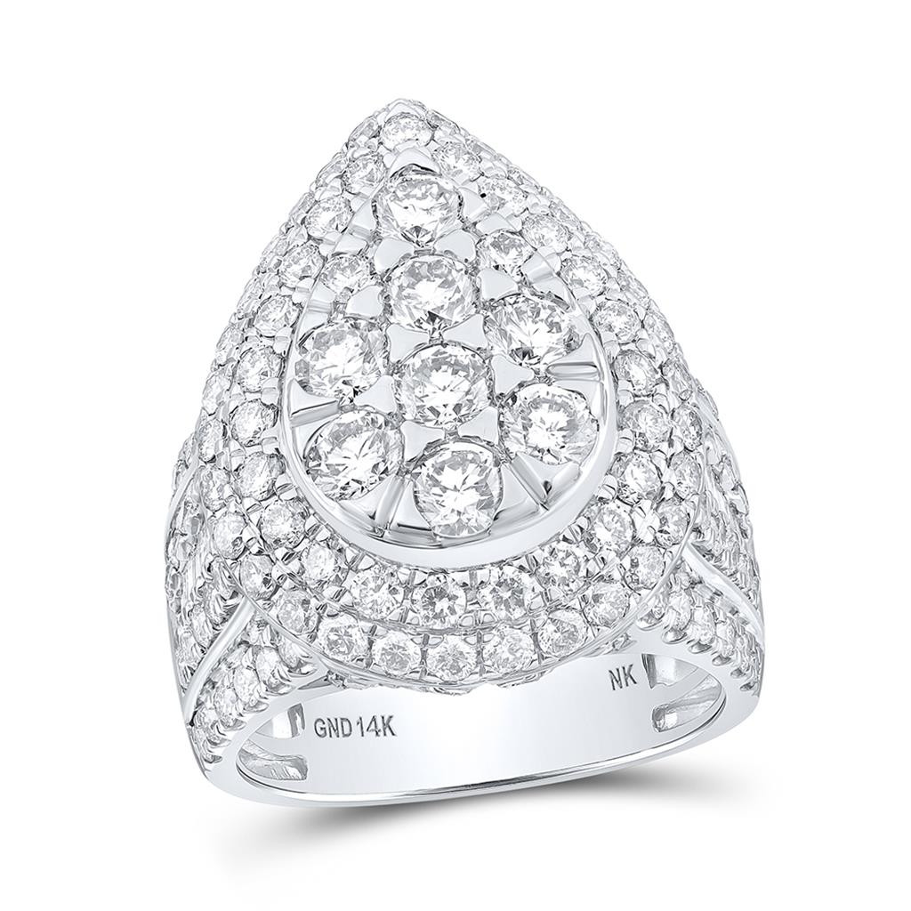 This exquisite diamond Domed Double Teardrop Halo Cocktail Ring, casted in 14k White Gold. Radiant with 4 ct. t.w. of Round cut diamonds and high polished to a bright lustrous shine. This statement ring will sparkle for a lifetime, a look she'll always treasure. Diamonds are Prong set in-between the White Gold mounting to securely fasten the diamonds. The diamonds are hand set precisely to give it a smooth uniform flow. Solid mounting, the ring weighs approx. 11.89 gr. All diamonds in this ring are matching in clarity and color. Currently this ring is ladies size 7, if you would like this ring in a different size please message us, for resizing charges and we will get back to you right away. This ring can be sized at your local jeweler as well.