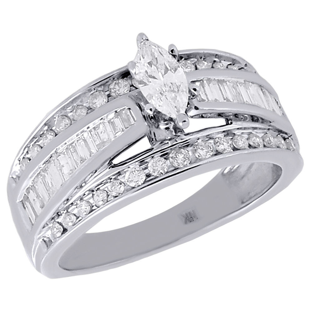 This solitaire ring is beautifully crafted in 14K white gold, the engagement ring features a center solitaire marquise cut diamond. Tapered baguette-cut diamond flank this center arrangement, while additional round diamonds adorn the polished frame. Radiant with1 ct. total weight of diamonds and a bright polished shine, this engagement ring will sparkle for a lifetime. This ring has genuine diamonds in prong and channel setting. The diamonds are machine set precisely to give it a smooth uniform flow. Solid mounting, the ring weighs approx. 5.7 grams of gold. All diamonds in this ring are matching in clarity & color for good shading. The center solitaire is 0.25 ct. by itself.