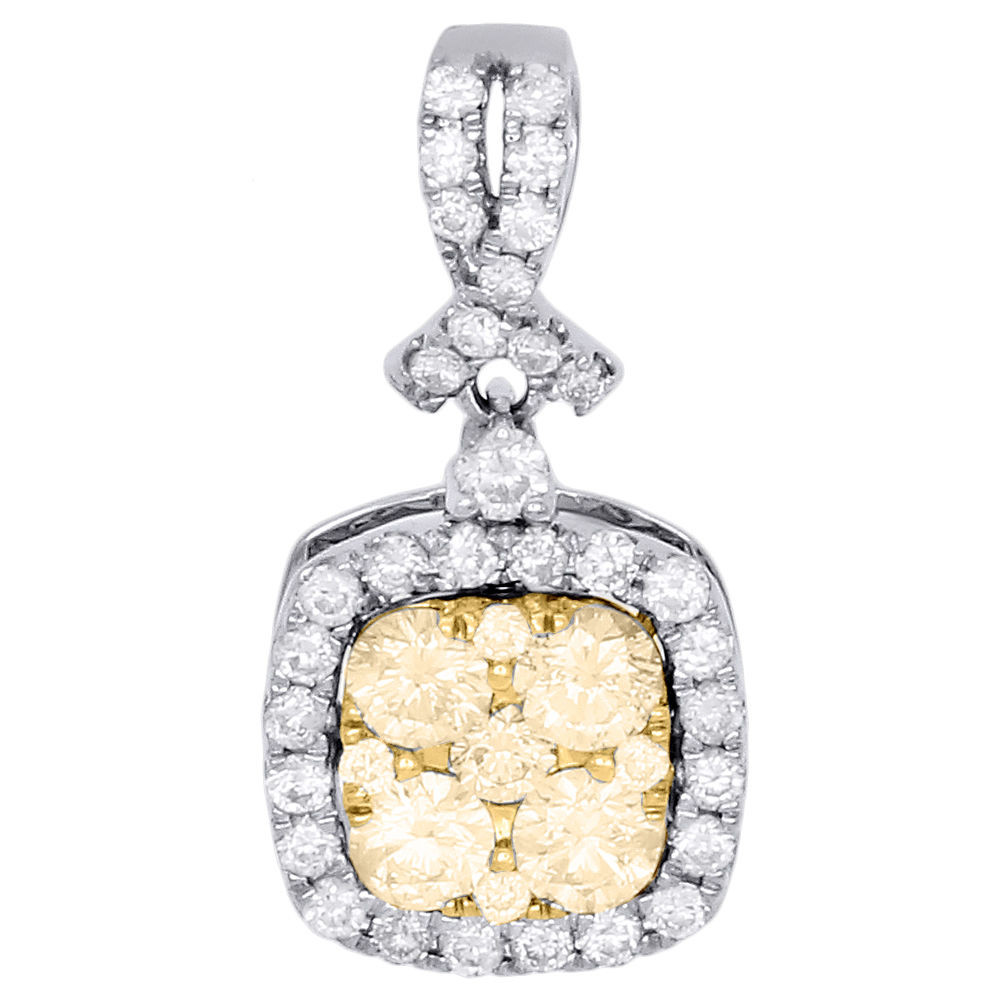 Rodeo Jewelers brings you this beautiful fashioned pendant. Simple yet striking, this white and natural yellow diamond pendant is a great look with any attire. Created in 14k white gold. This square pendant has round diamonds in shared prong setting close together for a brilliant shine. Radiant with 1.02 ct. total diamond weight. This pendant is 0.80" long and would make a perfect gift for any occasion.