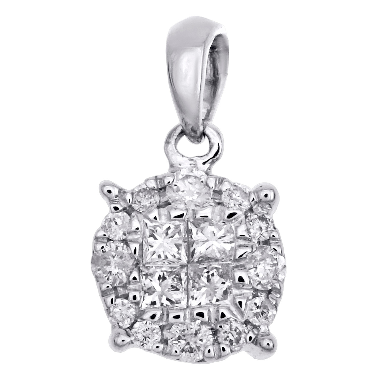 This eye-catching genuine diamond Soleil Collection Pendant is casted in 14K White Gold and shimmering White Round & Princess Diamonds, ensuring sparkle from every angle. Radiant with 0.25 ct. t.w. of genuine diamonds, this pendant is high-polished to lustrous shine. Exclusive style has well built frame, with open back to withstand everyday wear and tear. The diamonds are securely held in a Prong & Invisible Setting, making the overall appearance larger and lustrous. Matching bale to complete the exclusive style. These are all 100% genuine round diamonds and all diamonds are of matching quality throughout. This pendant is 0.9 gr. and 0.50" in length. This will be a great addition to your growing jewelry collection.