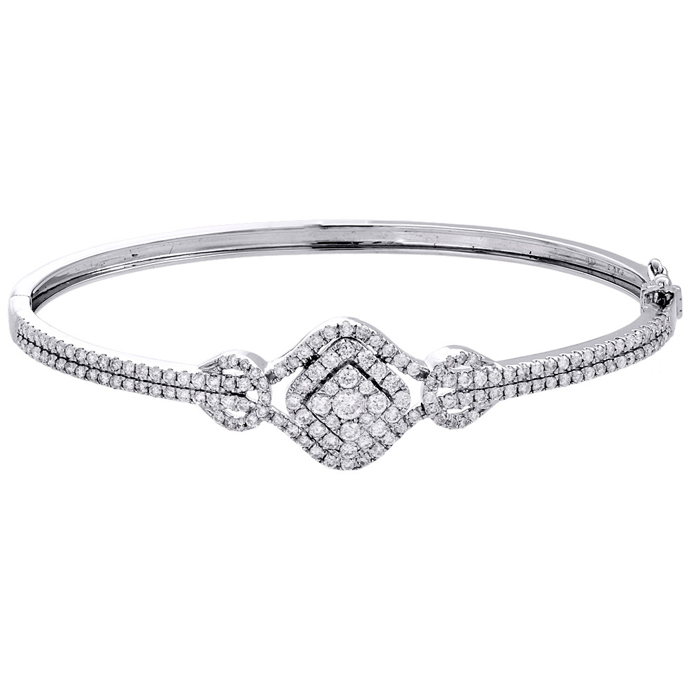 This eye-catching diamond bangle bracelet is crafted in solid 14K white gold. This stunning style features cluster diamond design. A classic look she'll turn to often, this bangle captivates with 1.68 ct. t.w. of diamonds and a polished shine. An exceptional design, this bracelet is polished to a bright shine. Securely locking with a durable hinged lock with safety fold-over latch. These are all 100% genuine brilliant round diamonds. This bangle will fit up-to 7.50" wrist size and is 5.75mm wide.