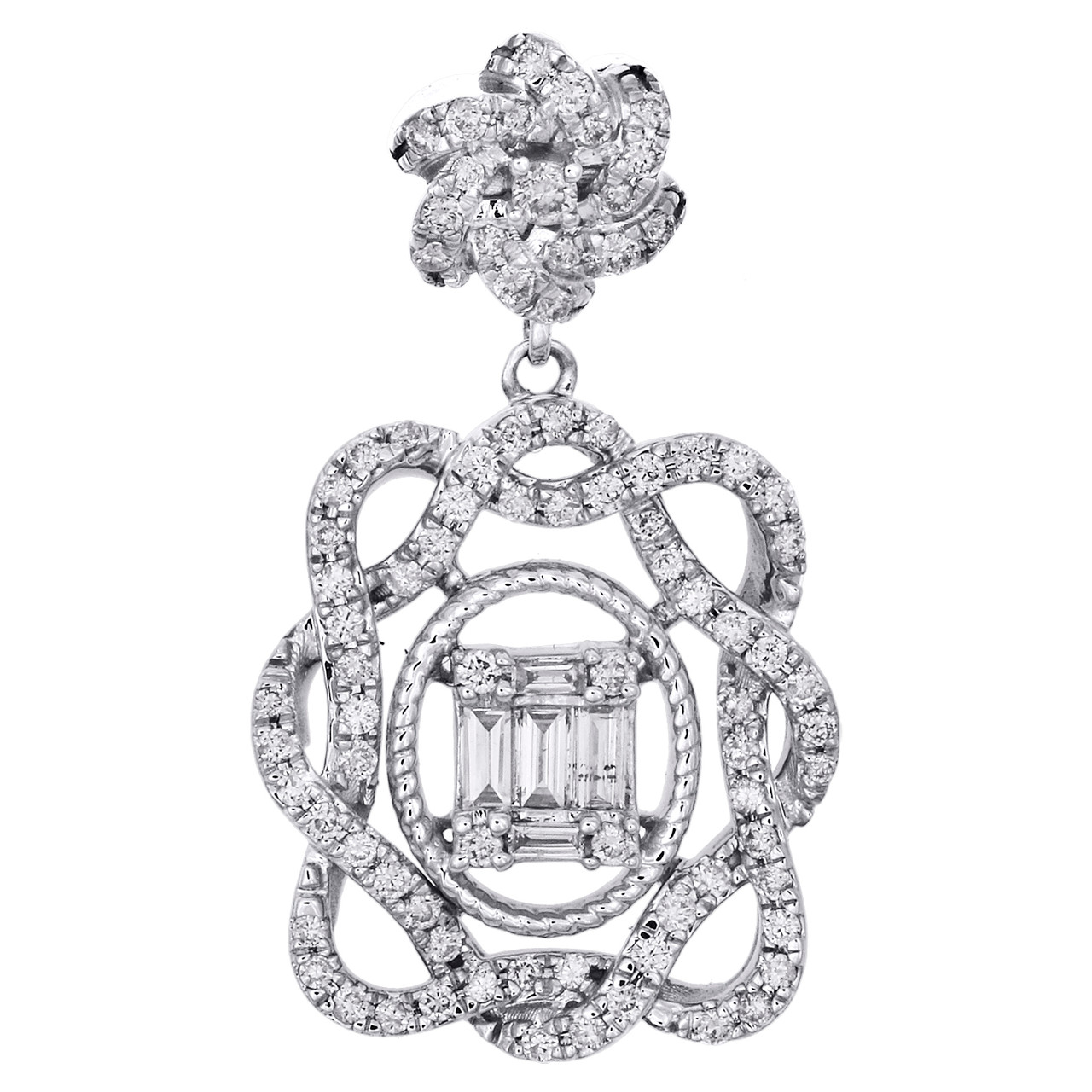 - 14K White Gold Round & Baguette Diaamond Fancy Statement Pendant 1" Charm 3/8 CT