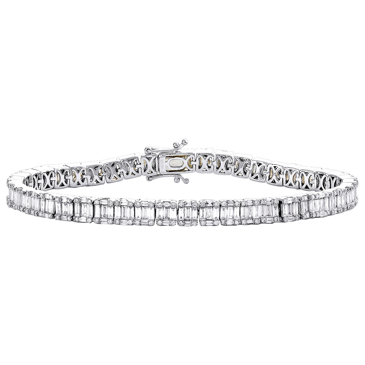 A new sophisticated and elegant look added to our diamond bracelet collection is this Statement Link Tennis Bracelet. Casted in solid 14K White Gold and genuine diamonds. Well built, this bracelet has sturdy frame for durability for comfort fitting. All round and baguette cut diamonds are in Prong and Invisible setting, making the overall appearance larger and lustrous. This statement piece will make a great addition to your jewelry collection. Radiant with 4.80 ct. t.w. of natural White diamonds, this bracelet is high polished to a lustrous bright shine. All the Round and Baguette cut diamonds in this bracelet are equivalent in color and clarity, giving this bracelet a comparable shine and luster throughout. This bracelet has fancy Box Clasp with additional Safety Latch for secure wear. This Solitaire Tennis Bracelet measures 5mm wide at its widest point and weighs 17.4 gr.