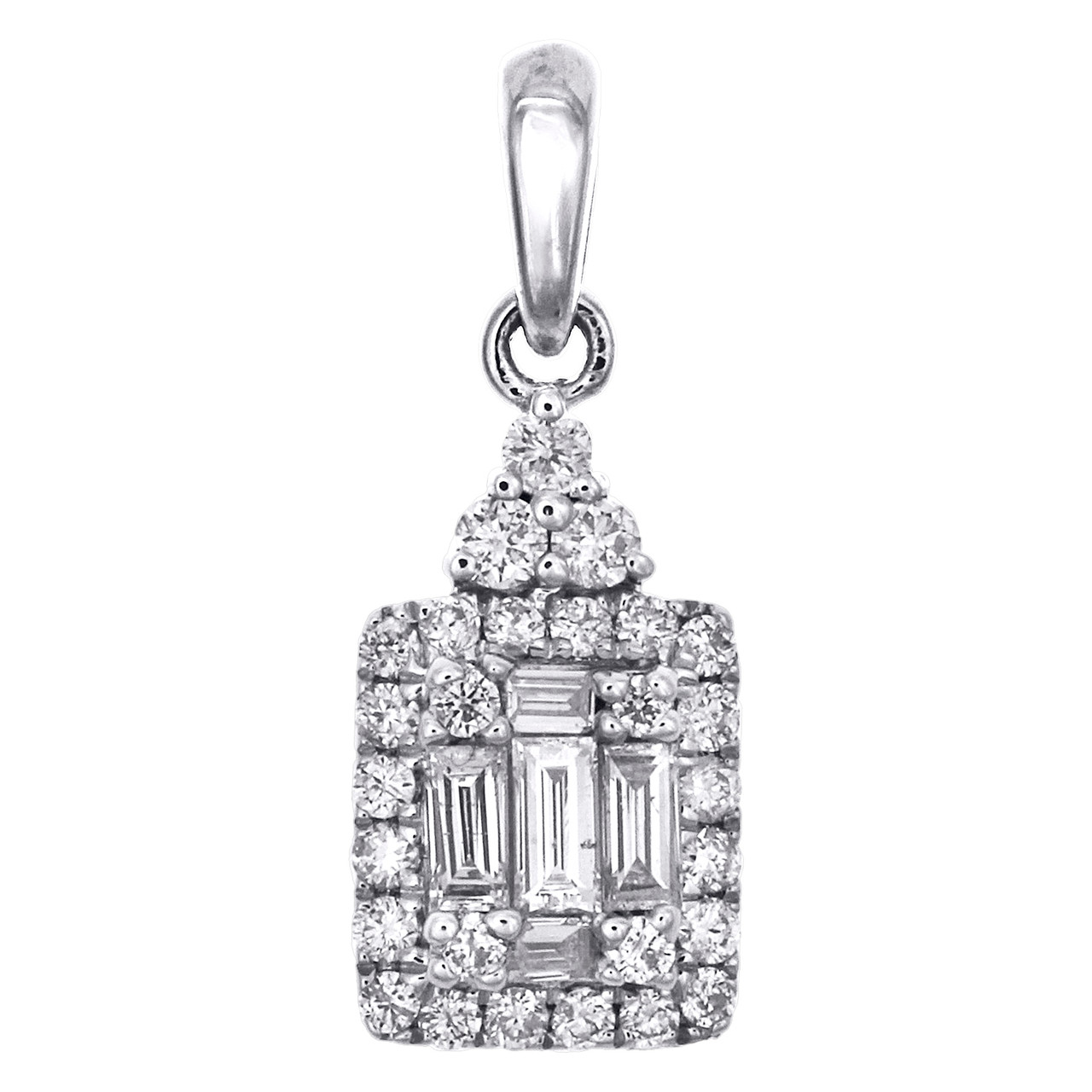 (0.7 gr. of 14K White Gold | Total Carat Weight: 0.33 ct. t.w. of White Diamonds | Length: 0.65" (including bail) | Width: 0.25" | Thickness: 4mm | Clarity: I1 - I2 | Color: G - H | Women's Genuine Round and Baguette Diamond Rectangle Halo Pendant Charm)