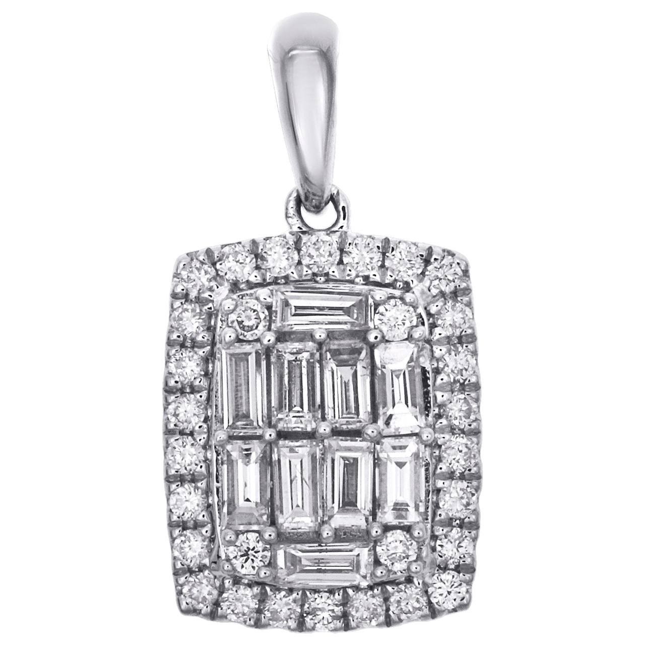 (1.4 gr. of 14K White Gold | Total Carat Weight: 0.50 ct. t.w. of White Diamonds | Length: 0.70" (including bail) | Width: 0.35" | Thickness: 5mm | Clarity: I1 - I2 | Color: G - H | Women's Genuine Round and Baguette Diamond Rectangle Halo Pendant Charm)