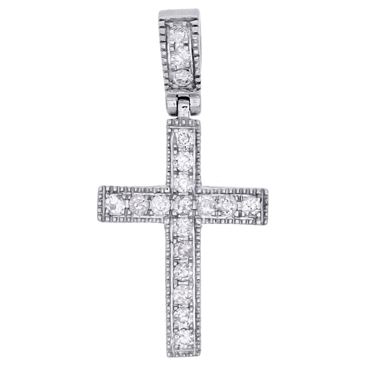 - 14K White Gold Round Diamond 1 Row Cross Pendant Milgrain Edge Charm 0.20 Ct.