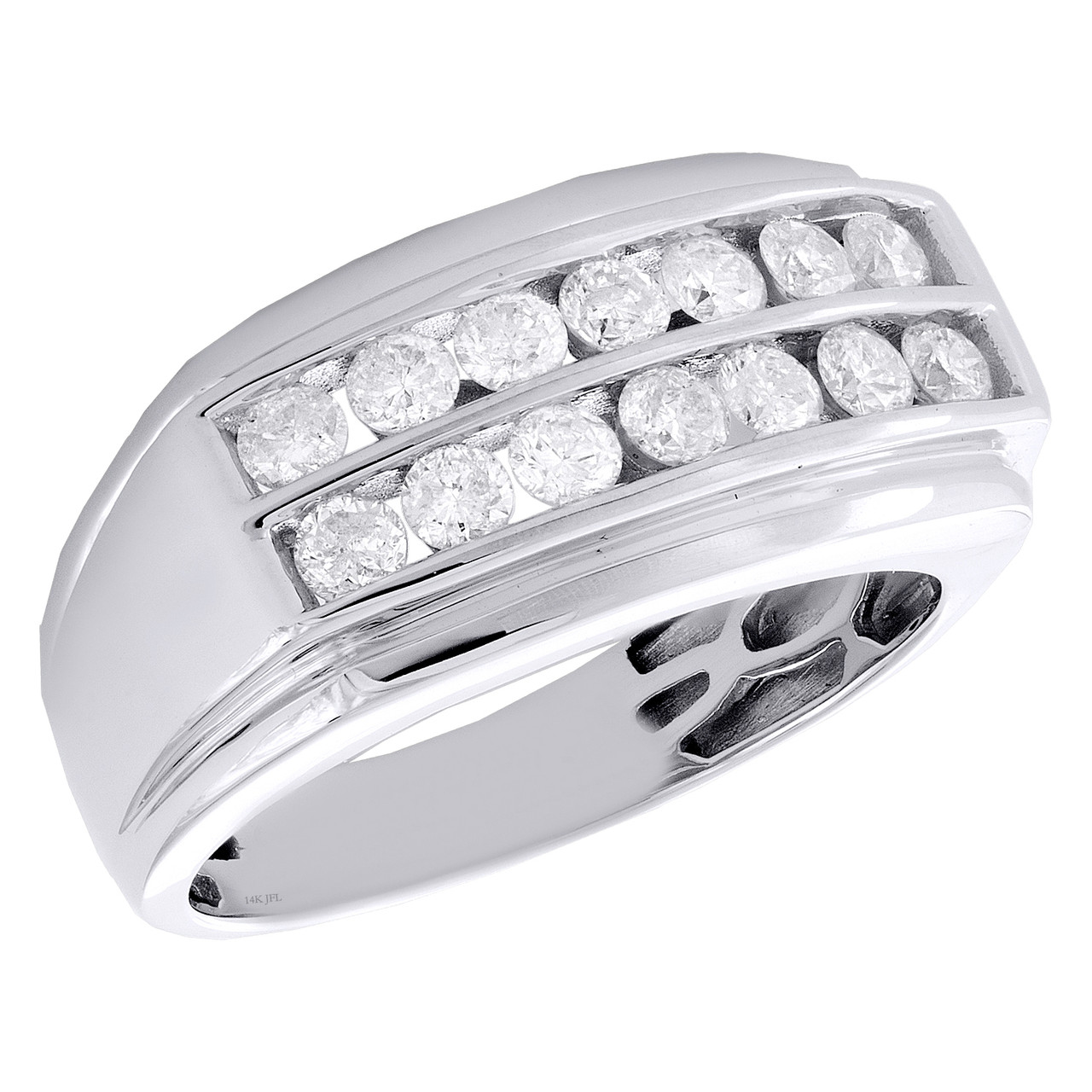 A bold and manly look, this sparkling diamond ring is just the perfect style for him. Brilliantly casted in 14K White Gold, this ring features sparkling diamonds set in 11mm wide frame. This ring design was intricately thought out so it can be worn for any occasion, no matter how casual or fancy. Double Row frame is the focal point of this fancy statement band, making a bold fashion statement. Make an impression with this exclusive ring captivating 1 ct. t.w. of genuine Round cut diamonds, with high polished to a lustrous shine. This ring is caged back for comfort fit and weighs approx. 7.2 gr. All diamonds are 100% natural / genuine and are matched to perfection. The diamonds are secured in Channel setting, making the overall appearance larger and lustrous. Available in size 10. If a different size is needed, please send us a message, sizing charges apply.