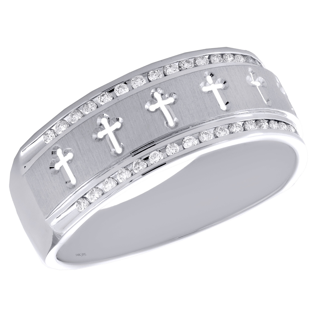 - 14K White Gold Round Diamond Fancy Religious Cross Wedding Band 8mm Ring 1/4 CT.