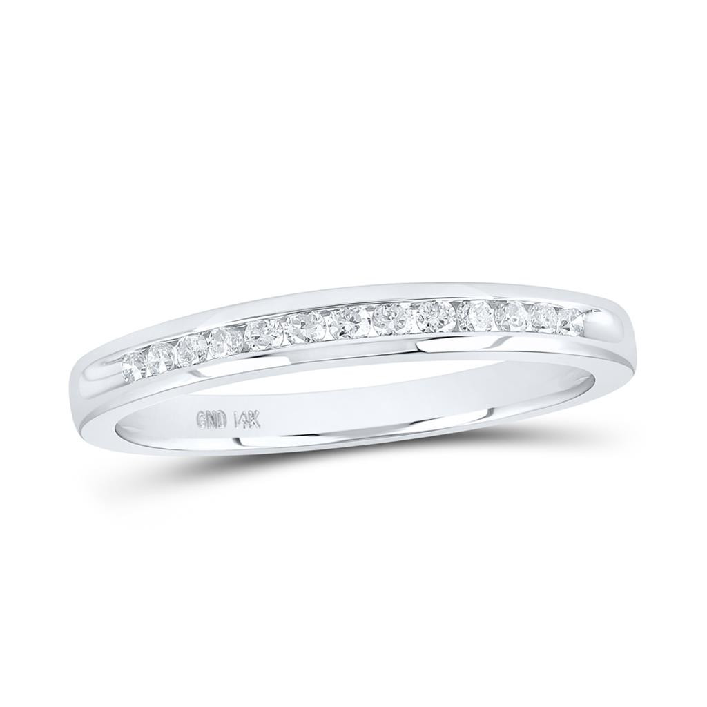This exquisite diamond Channel Set Single Row Wedding Band, casted in 14k White Gold. Radiant with 0.17 ct. t.w. of Round cut diamonds and a bright high polished shine. This wedding ring will sparkle for a lifetime, a look she'll always treasure. Diamonds are held in between the gold mounting in Channel-Set setting. The diamonds are hand set precisely to give it a smooth uniform flow. Solid mounting, the ring weighs approx. 2.16 gr. All diamonds in this ring are matching in clarity and color. Currently this ring is ladies size 7, if you would like this ring in a different size please contact us, for resizing charges and we will get back to you right away. This ring can be sized at your local jeweler as well.