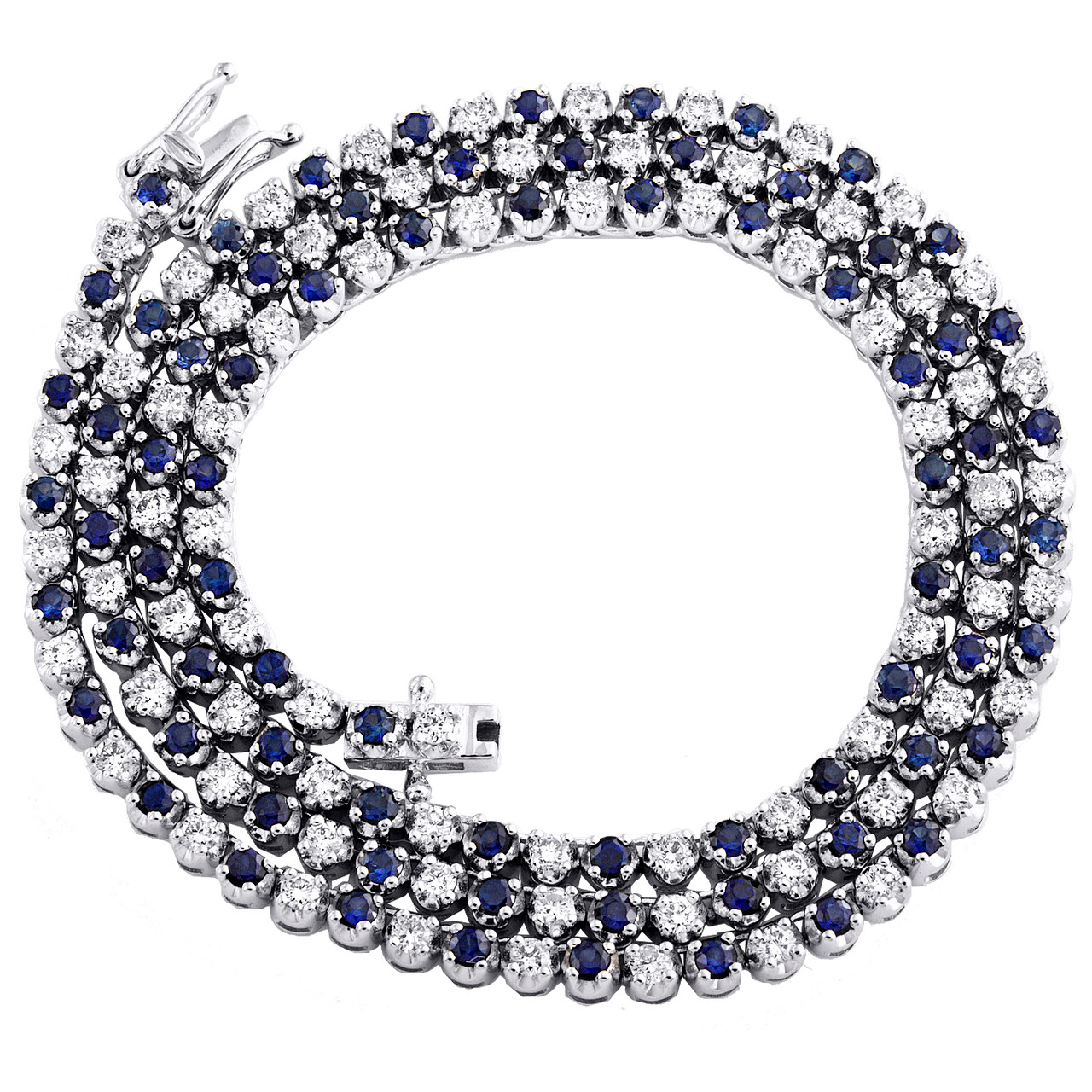 New to our Rodeo Jewelers collection is this classic Prong Set Natural Gemstone Tennis Necklace / Chain with genuine diamonds. Crafted in solid 14K White Gold, this chain has a well built frame to withstand daily wear and tear. These are all 100% full cut natural Round cut diamonds & gemstones in 4-Prong setting, making the overall appearance larger and lustrous. The diamonds & gemstones are of matching quality throughout. All diamonds & gemstones are 100% natural and are NOT enhanced in any way. Radiant with 2.25 ct. t.w. of White Diamonds and 3.33 ct. t.w. of Blue Sapphire Gemstone totaling 5.58 ct. t.w., this necklace high polished to a bright lustrous shine. This diamond & gemstone necklace is 18" long, 3mm wide and weighs approx. 19.8 gr.. Seamless diamond & gemstone Box Clasp closure ensures your chain is secured in style. This chain will make a great addition to your jewelry collection.
