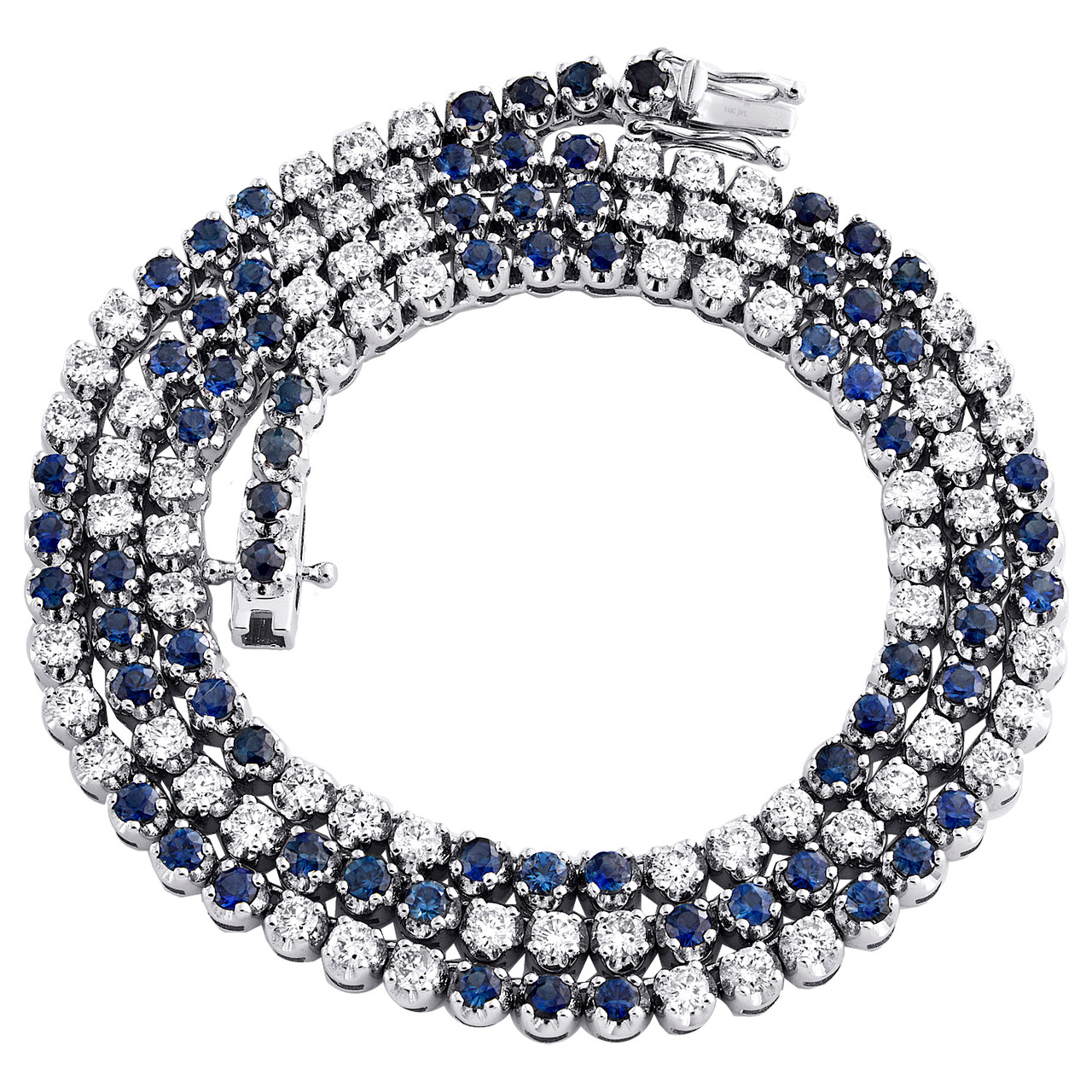 New to our Rodeo Jewelers collection is this classic Prong Set Natural Gemstone Tennis Necklace / Chain with genuine diamonds. Crafted in solid 14K White Gold, this chain has a well built frame to withstand daily wear and tear. These are all 100% full cut natural Round cut diamonds & gemstones in 4-Prong setting, making the overall appearance larger and lustrous. The diamonds & gemstones are of matching quality throughout. All diamonds & gemstones are 100% natural and are NOT enhanced in any way. Radiant with 3.50 ct. t.w. of White Diamonds and 4.88 ct. t.w. of Blue Sapphire Gemstone totaling 8.38 ct. t.w., this necklace high polished to a bright lustrous shine. This diamond & gemstone necklace is 18" long, 3.50mm wide and weighs approx. 21.5 gr.. Seamless diamond & gemstone Box Clasp closure ensures your chain is secured in style. This chain will make a great addition to your jewelry collection.